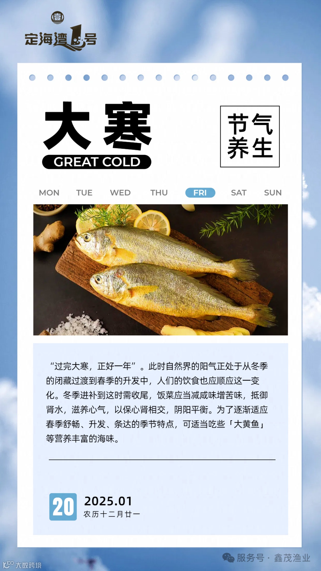 在这大寒的冬日里,让我们一同品尝大黄鱼的鲜美,感受这份来自大海与时节的馈赠,为寒冷的日子增添一抹温暖与满足。