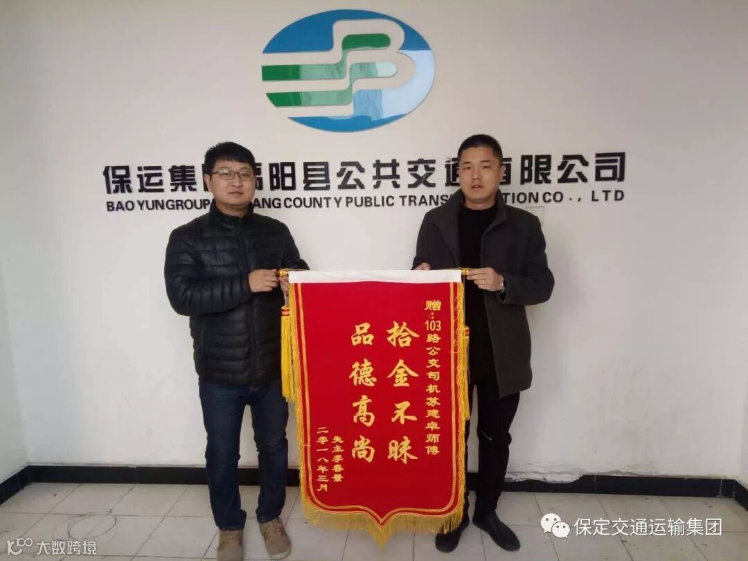 3月10日,高阳公交公司103路驾驶员苏建卓在完成发班任务清扫车厢中拾获手机一部,手机内有失主的很多重要信息及生意联系人,通过与手机中的失主亲属联系,最终将手机交还失主。为感谢驾驶员苏建卓的拾金不昧精神,失主特送来锦旗一面。