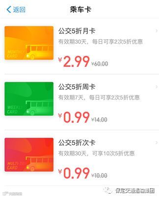据保运集团信息管理部负责人介绍,市民使用支付宝乘车时,需要“打开支付宝APP—付钱—乘车码—公交电子卡 —黄色活动文字”,根据个人乘车习惯,选择“2.99元起、公交五折月卡”、“0.99元起、公交五折周卡”、“0.99元起,公交五折次卡”选项,即可选择需要购买的乘车卡。用户花2.99元,即可获得每月60次一张五折优惠的公交卡,(单次优惠封顶1元)。