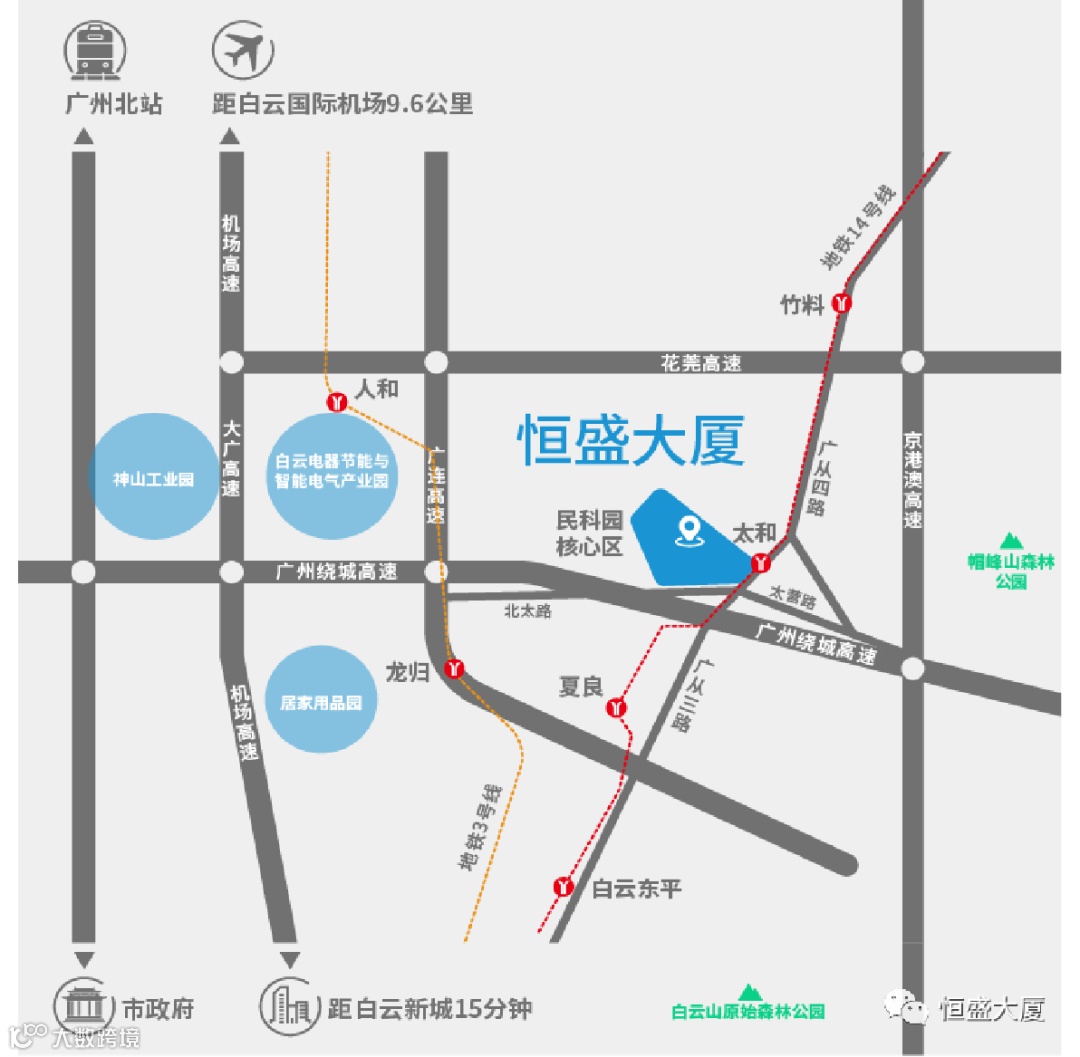 恒盛大厦周边,广州绕城高速、机场高速等纵横通达,地铁14号线、3号线北延段双龙交汇,20分钟直达白云机场,南下珠江新城、琶洲 CBD 畅通无阻。