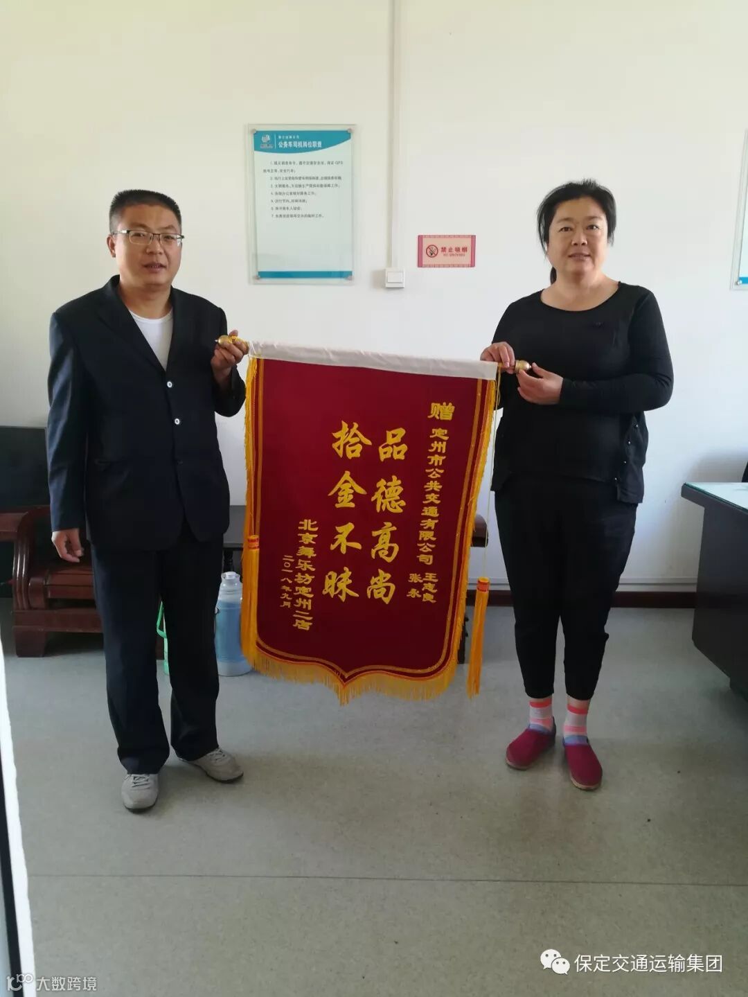 周女士是一名舞蹈学校教师,挎包里装着刚刚收取的学费,骑电车路过站前广场时,因躲避车辆不小心将600多元现金散落在地,正巧在车站广场等候发车的张师傅、王师傅看到,热心的司机师傅连忙上前提示并帮忙捡钱,分文不差的交还周女士。周女士感动极了,当即向两位司机表示感谢,但总感觉没有尽到心意,便通过交通运输行业服务监督电话12328对2位公交司机的行为进行表扬,感谢公交车为市民的出行提供便利的同时,也给城市带来了很小,但却很温暖、很感人的事迹。周女士在电话中说:“虽然钱不多,事情也不算大,但是两位司机师傅热心帮我捡钱时,感觉心中暖暖的。”并于10月9日专程将一面写有“拾金不昧、品德高尚”的锦旗送到公交公司,对驾驶员张永和王志良拾金不昧,乐于助人的行为再次表示感谢。定州交通局督查室李主任在呈办函中批复,在全系统内学习,传递正能量。