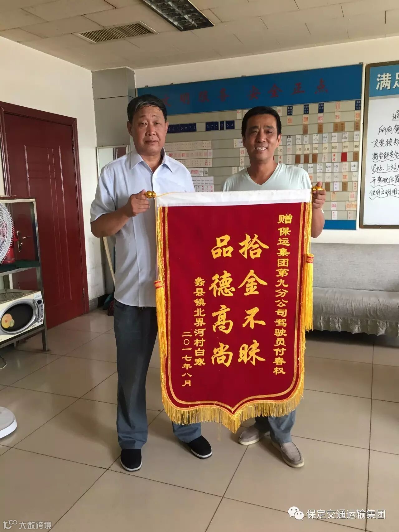 失主白寒被驾驶员付春权师傅这种拾金不昧急旅客所急的高尚品德所感动,为表达自己的感谢特送来一面写有“拾金不昧 品德高尚”的锦旗。