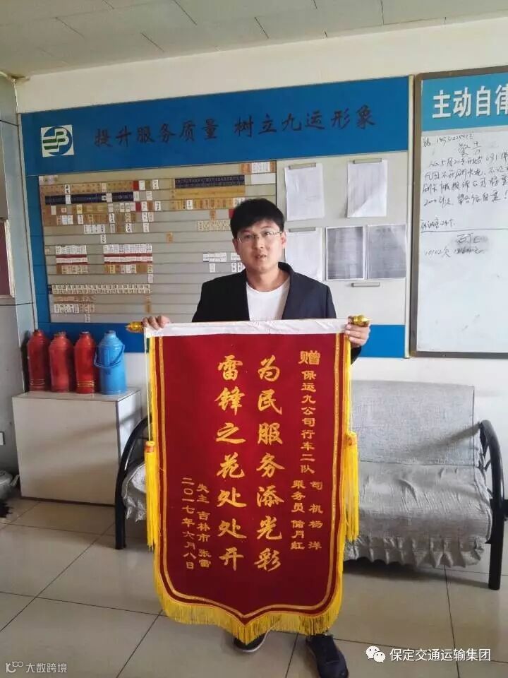 次日失主张先生高兴的来到九公司行车二队办公室,接过钱包,把一面写有“为民服务添光彩,雷锋之花处处开”的锦旗送到队管人员手中,并执意要见一面司机,请他吃饭,还掏出200元钱表示酬谢。此时驾驶员杨洋正在发往高阳的路上,执行出车任务。应失主要求,我们再一次拨通杨洋电话,转达失主的谢意,杨洋幽默地说道:“不用客气,请把钱收好,这是我应该做的,如果非要感谢,再次遇见,就叫我雷锋好了!”张先生开心的说:“我会永远记住你这样的好人,第一次来保定办事,就见识了保定的文明之风,不愧是魅力保定、文化古城,以后有机会再来,我一定会再次看望你们”。