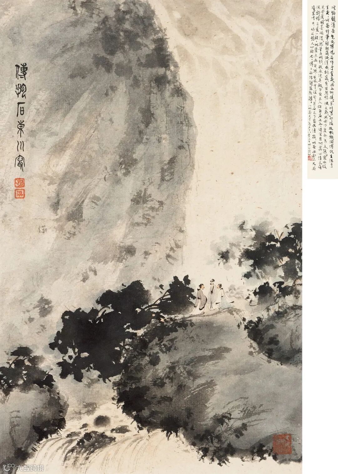 题跋:此幅《观瀑图》先父傅抱石作于重庆。画上所提“东川写”即指抗战期间傅氏生活于重庆,此图行笔轻松潇洒、清爽利落,有自然畅快之感。画面以泉水为主题,泉水从天而落,用墨机淡,然笔力刚劲,故水流奔放。下有三人沾巨石之上,谈笑自如,其心情之痛快舒畅可见一般。树叶点画自然,在风中摇曳。巨石之下泉水涌出。此图画面不大,而境界博大,好不畅人心胸也。傅二石拜观并敬题。(此图尺寸为三十八乘二十四公分)