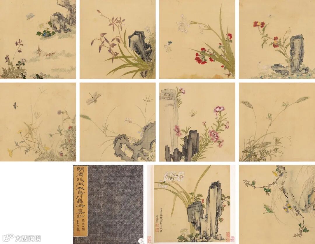 题签:明周服卿花鸟草虫册真迹。绢本十帧,石园居士题。