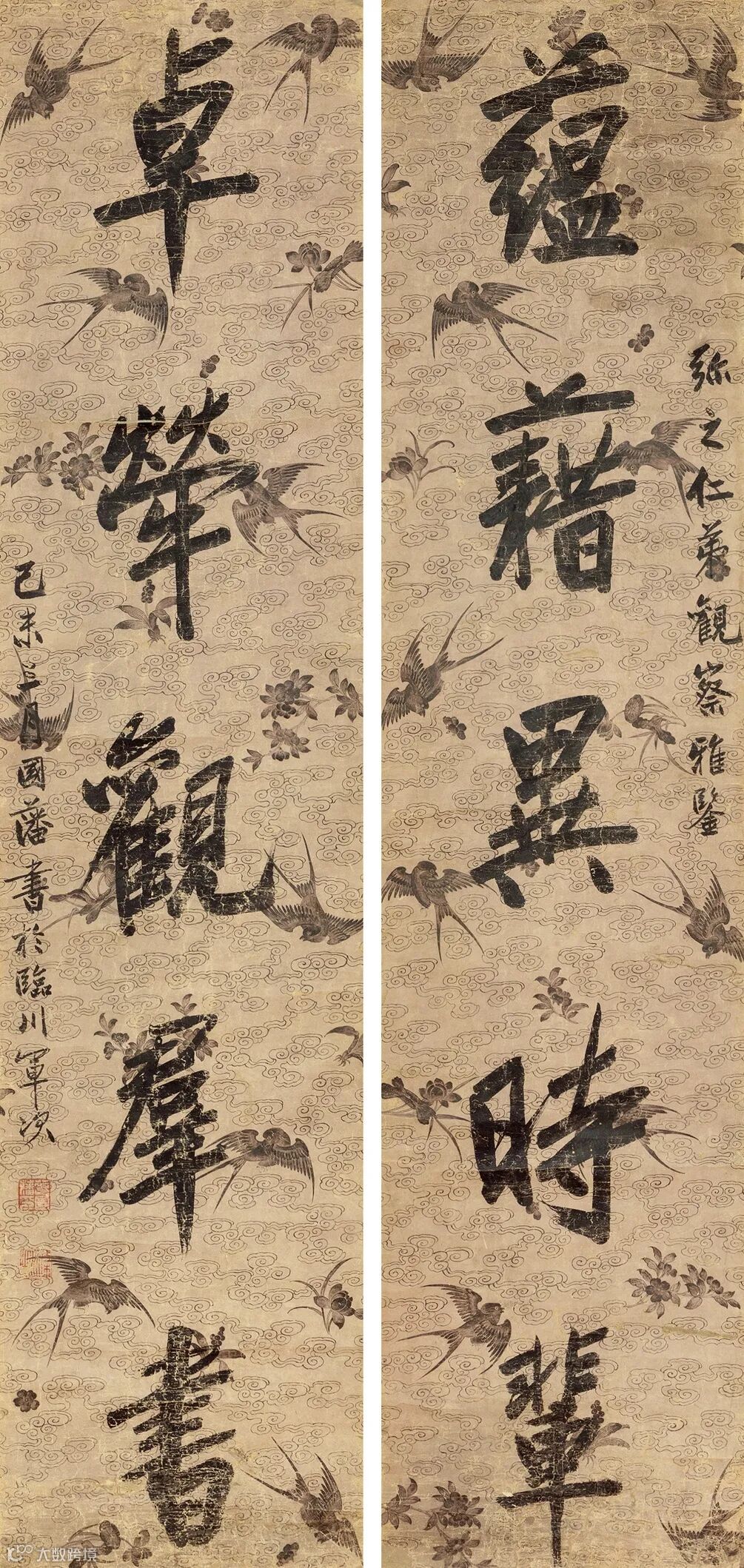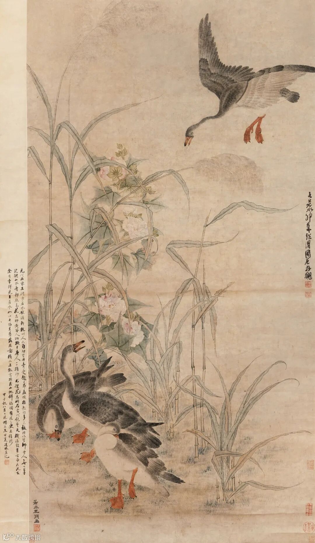 题跋:1.王若水神笔,绍渭周左拜观。2.元代画家王渊,字若水,号淡轩,杭州人氏。自幼习丹青,受赵子昂孟頫指教颇多之故,所作皆师古人,无一笔院体,山水有郭熙意,花鸟师黄筌,人物拟于唐人,一一精妙,尤擅花鸟竹石,当代绝艺,天机溢发,肖古而不泥古。余有幸得见王若水如此大幅芙蓉落雁图精品,与故宫所藏山桃锦鸡图有过之,更为精彩。甲子秋八月下浣畅安王世襄过眼并记。