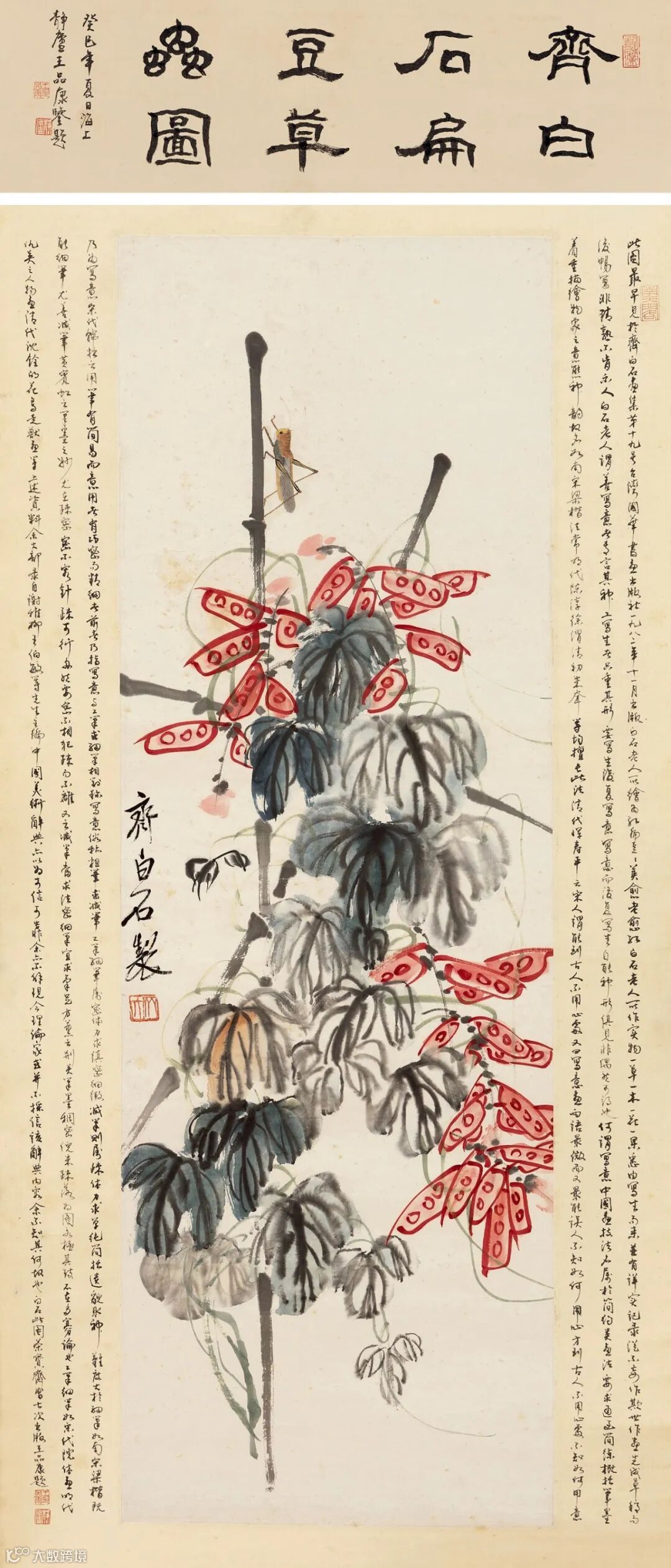 题跋:1.齐白石扁豆草虫图。癸巳年夏日,海上静庐王品康鉴题。