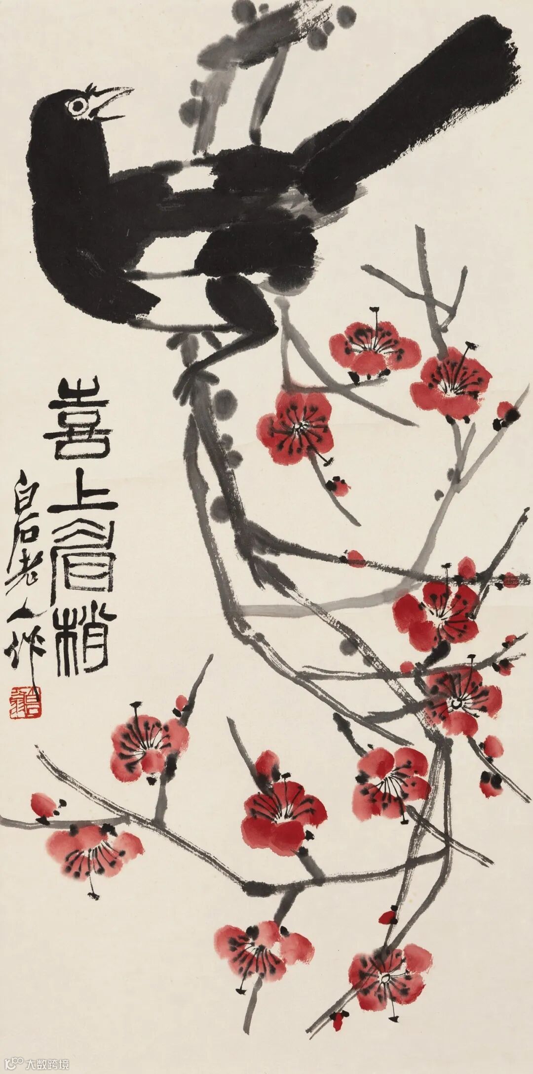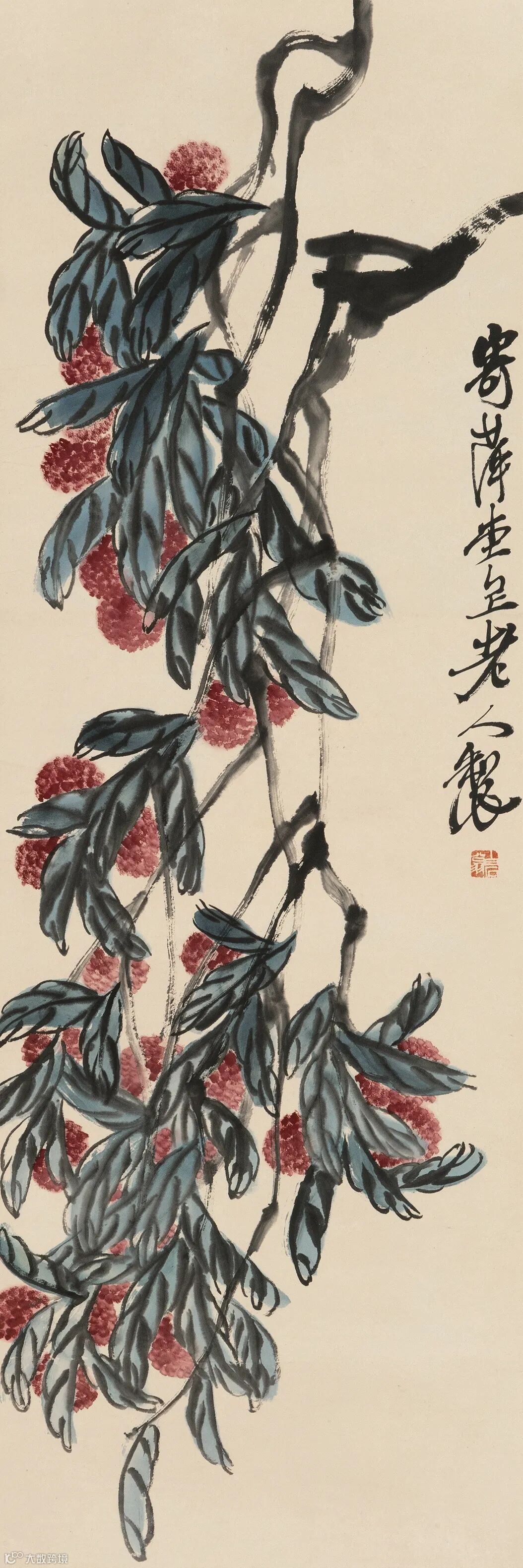2.此图最早见于《齐白石画集》第十九号,台湾国华书画出版社一九八二年十一月出版。白石老人所绘为红扁豆,豆荚愈老愈红。白石老人所作实物,一草一木一花一果,悉由写生而来,并有详实记录,从不妄作欺世。作画先成草稿而后畅写,非精熟不肯示人。白石老人谓善写意者专言其神,工写生者只重其形,要写生后复写意,写意而后复写生,自能神形俱见,非偶然可得也。何谓写意?中国画技法名,属于简约类画法,要求通过简练概括笔墨,着重描画物象之意态神韵,故名。如南宋梁楷、法常,明代陈淳、徐渭,清初八大山人等均擅长此法。清代恽寿平云,宋人谓能到古人不用心处,又曰,写意两语最微而又最能误人,不知如何用心方到古人不用心处,不知如何用意乃为写意。宋代韩拙云,用笔有简易而意用者,有巧密而精细者。前者乃指写意,与工笔或细笔相对称,写意俗称粗笔或减笔。工笔细笔属密体,力求缜密细致。减笔则属疎体,力求单纯简括,遗貌取神,难度大于细笔。如南宋梁楷,既能细笔,尤善减笔。黄宾虹云,笔墨之妙尤在疎密,密不容针,疎可行舟,然要密不相犯,疎而不离。又云,减笔当求法密,细笔宜求气足。方薰云,荆关笔墨稠密,倪米疎落为图,各极其致,不在多寡论也。工笔细笔如宋代院体画,明代仇英之人物画,清代沈铨的花鸟走兽画等。上述资料,余大部录自谢稚柳、王伯敏等先生主编《中国美术辞典》,亦以为可信可靠。余亦不解,现今理论家或并不采信该辞典内容,余不知其何故也。白石此图荣宝斋曾七次出版。王品康题。