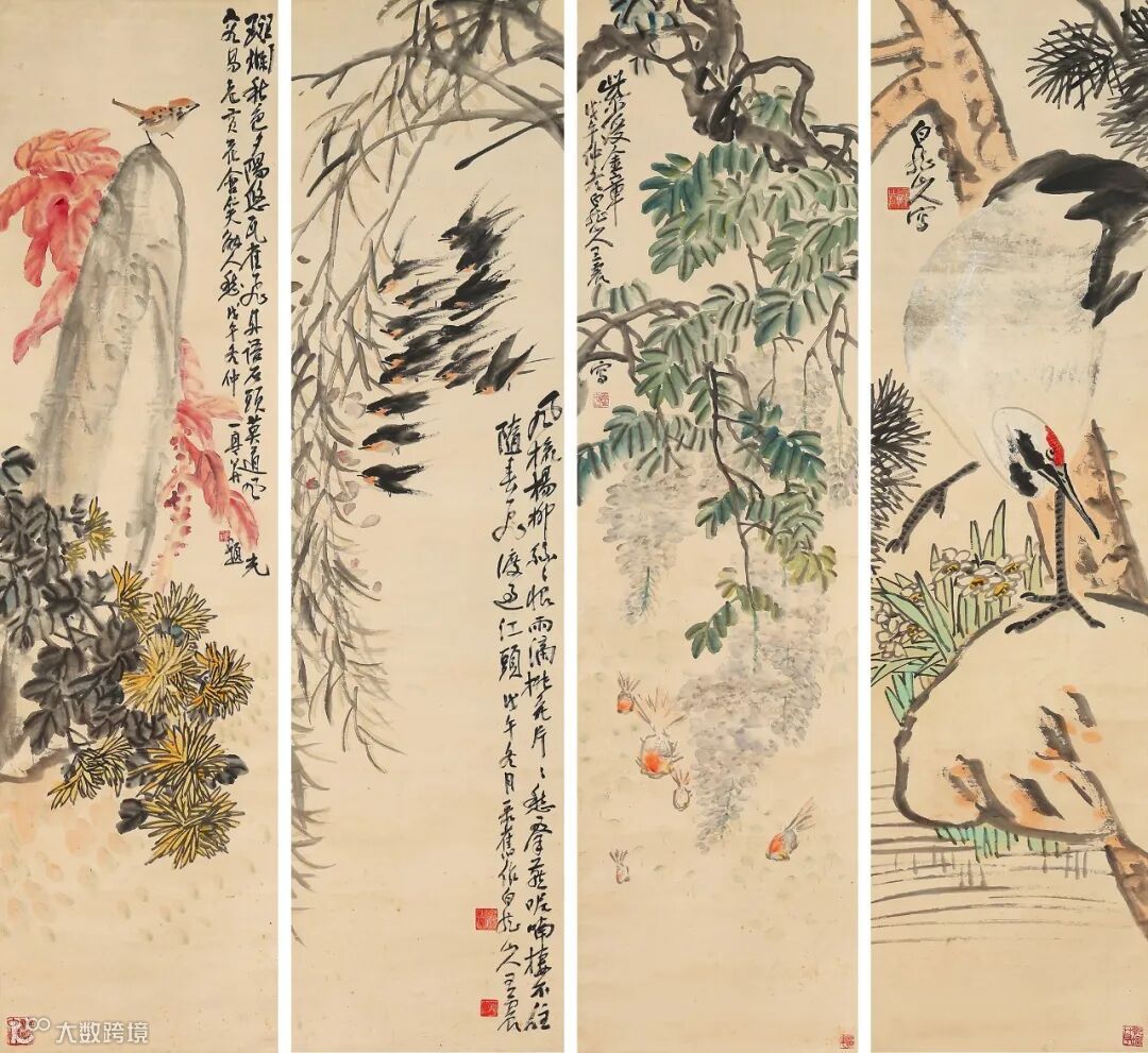 款识:1.白龙山人写。2.紫绶金章,戊午仲冬白龙山人王震写。3.风梳杨柳丝丝恨,雨滴桃花片片愁。群燕呢喃栖不住,随春飞渡过江头。戊午冬月录旧作,白龙山人王震。4.斑斓秋色夕阳悠,瓦雀飞来语石头。莫道风光容易老,黄花含笑解人愁。戊午冬仲一亭并题。