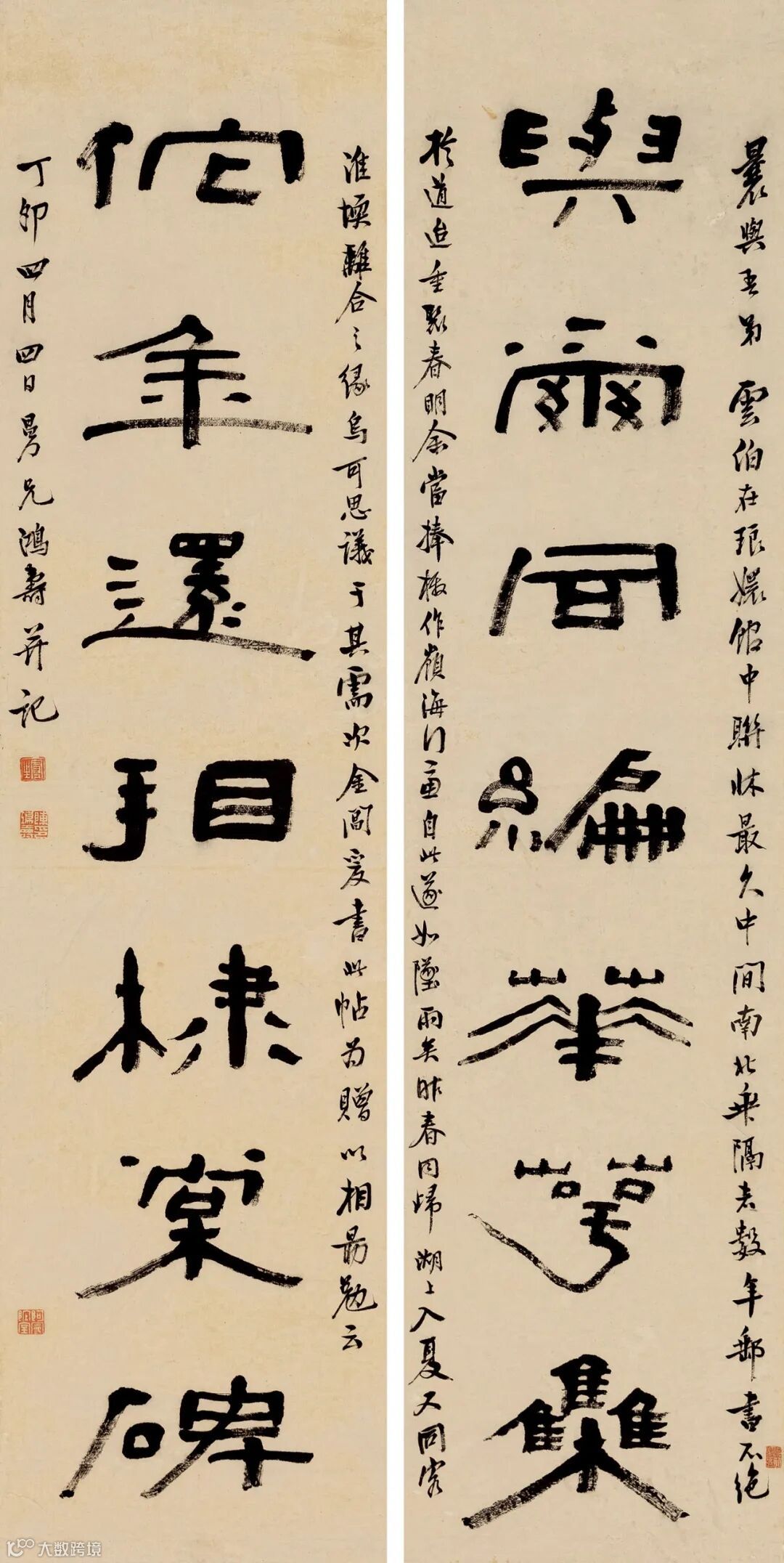 款识:曩与吾弟云伯在琅嬛馆中联床最久,中间南北垂隔者数年。邮书不绝于道。迨重聚春明,余当捧檄作岭海行廉,自此遂如坠雨矣。昨春同归湖上,入夏又同客淮堧,离合之缘,乌可思议。于其需次金阊,爰书此帖为赠,以相勗勉云。丁卯四月四日,曼兄鸿寿并记。