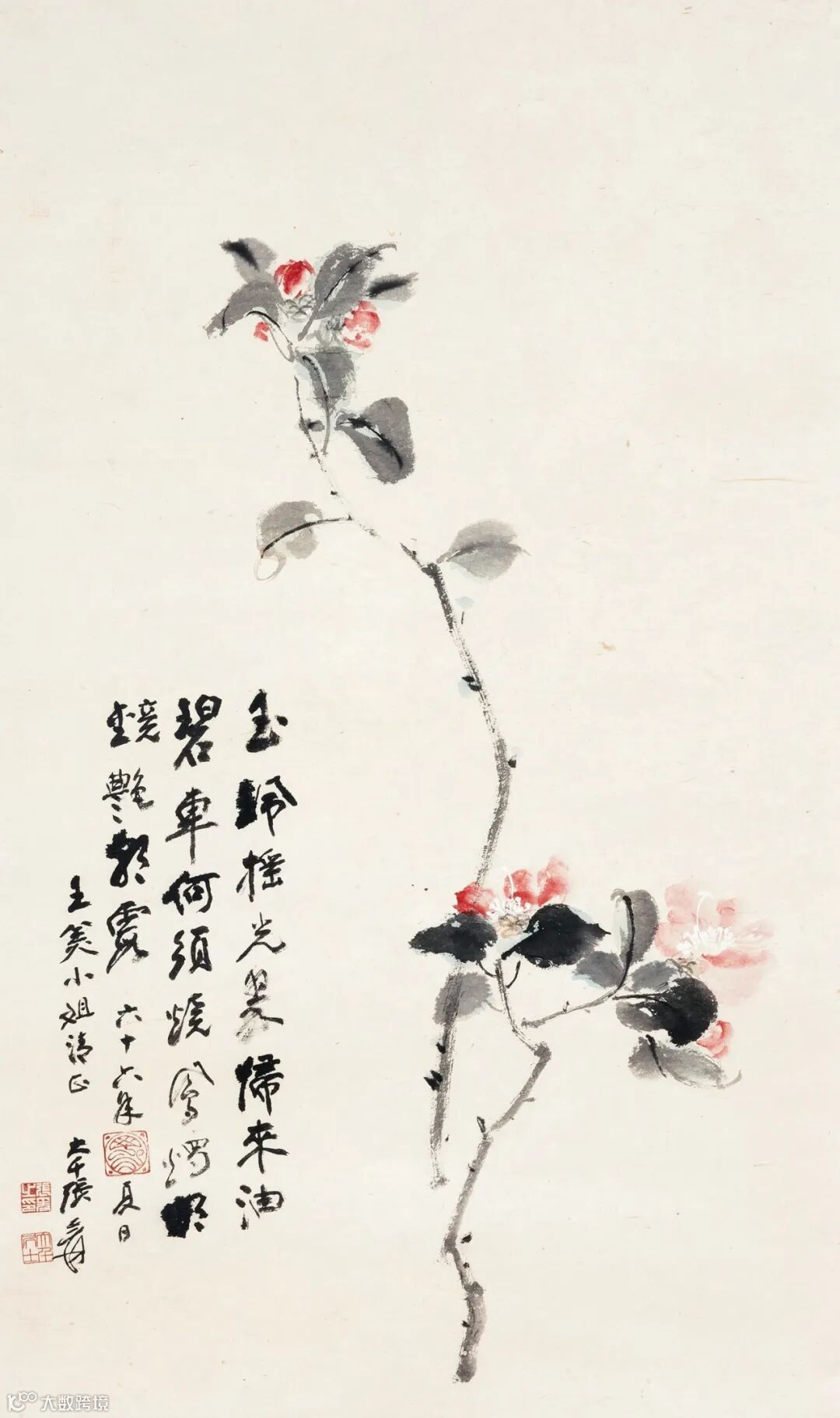 款识:玉佩摇光翠,归来油碧车。何须烧凤烛,明镜艷朝霞。六十六年夏日,王美小姐清正,大千张爰。