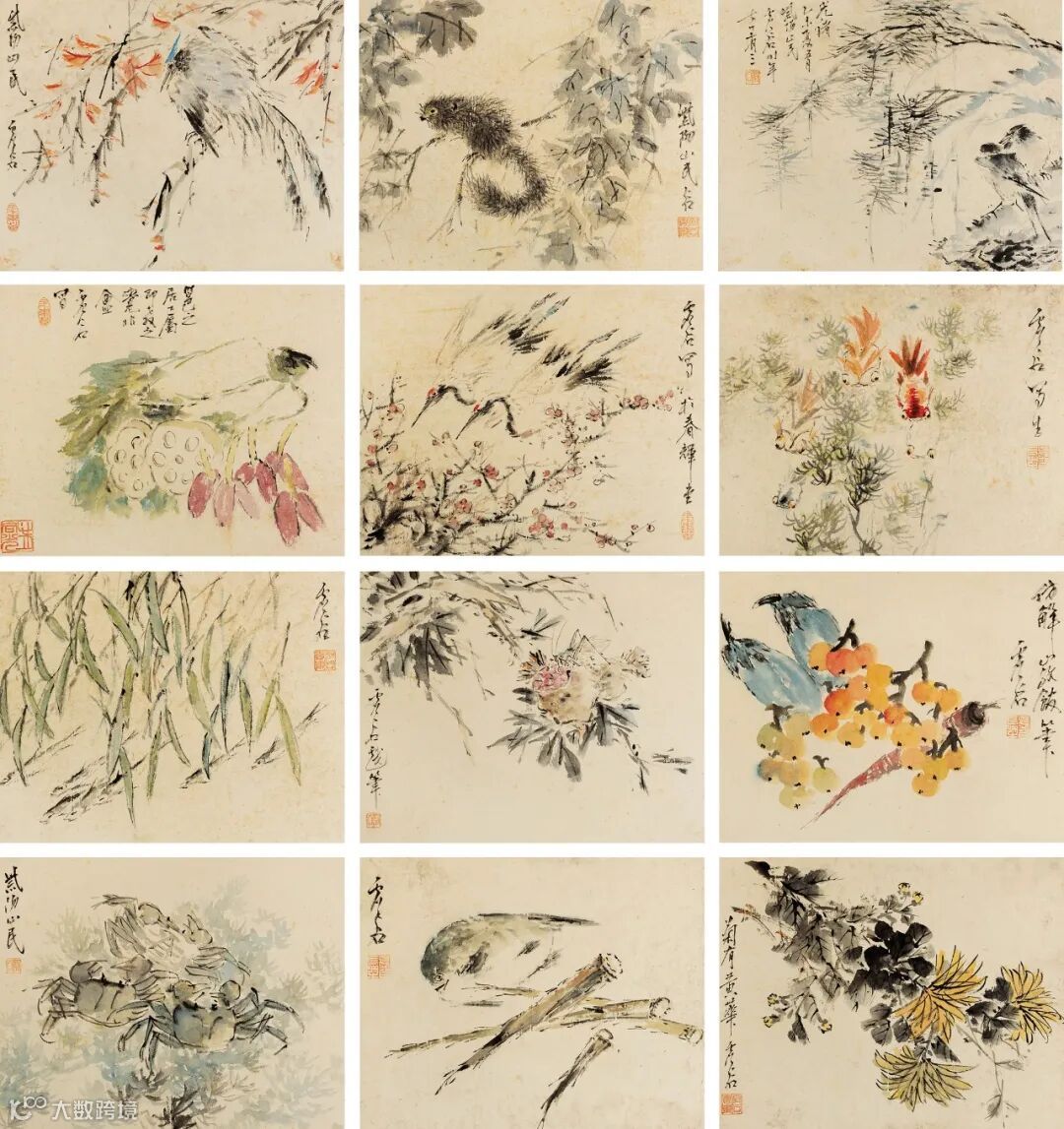 款识:1.紫阳山民谷。2.虚谷写生。3.虚谷写于春辉堂。4.邕之居士属即教之,觉非盦虚谷写。5.紫阳山民。6.菊有黄花,虚谷。7.仿解巖馆笔,虚谷。8.虚谷戏笔。9.虚谷。10.紫阳山民虚谷。11.虚谷。12.光绪乙未夏五月,紫阳山民虚谷时年七十有三。