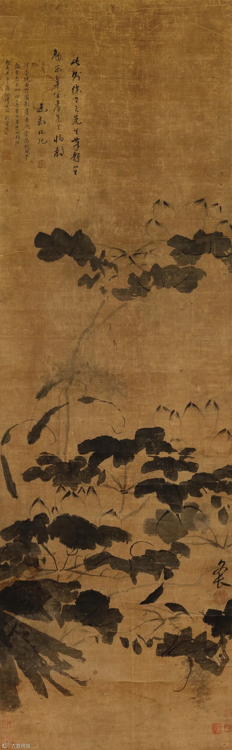 题跋:1.浮香绕曲岸,园影覆华池。常恐秋风早,飘零君不知。徐文长墨荷图逸品,题似勉禹老年翁词坛咲正,新安吴廷。