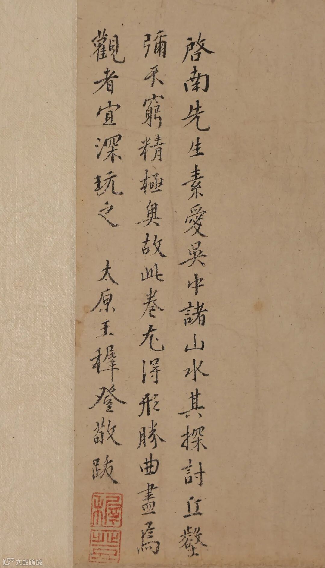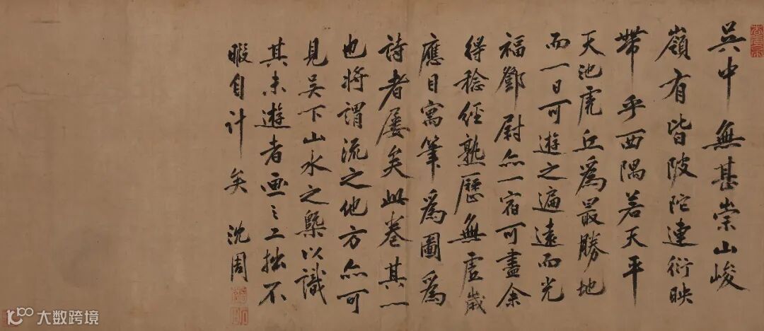 1.吴中无甚崇山峻岭,有皆陂陀连衍映带乎。西隅若天平、天池、虎丘为最胜地,而一日可游之遍,远而光福、邓尉亦一宿可尽,余得稔经熟历无虚岁,应目寓笔为图为诗者屡矣,此卷其一也,将谓流之他方,亦可见吴下山水之概,以识其未游者。画之工拙不暇自计矣,沈周。2.启南先生素爱吴中诸山水,其探讨丘壑,弥不穷精极奥,故此卷尤得形胜曲尽焉,观者宜深玩之,太原王穉登敬跋。