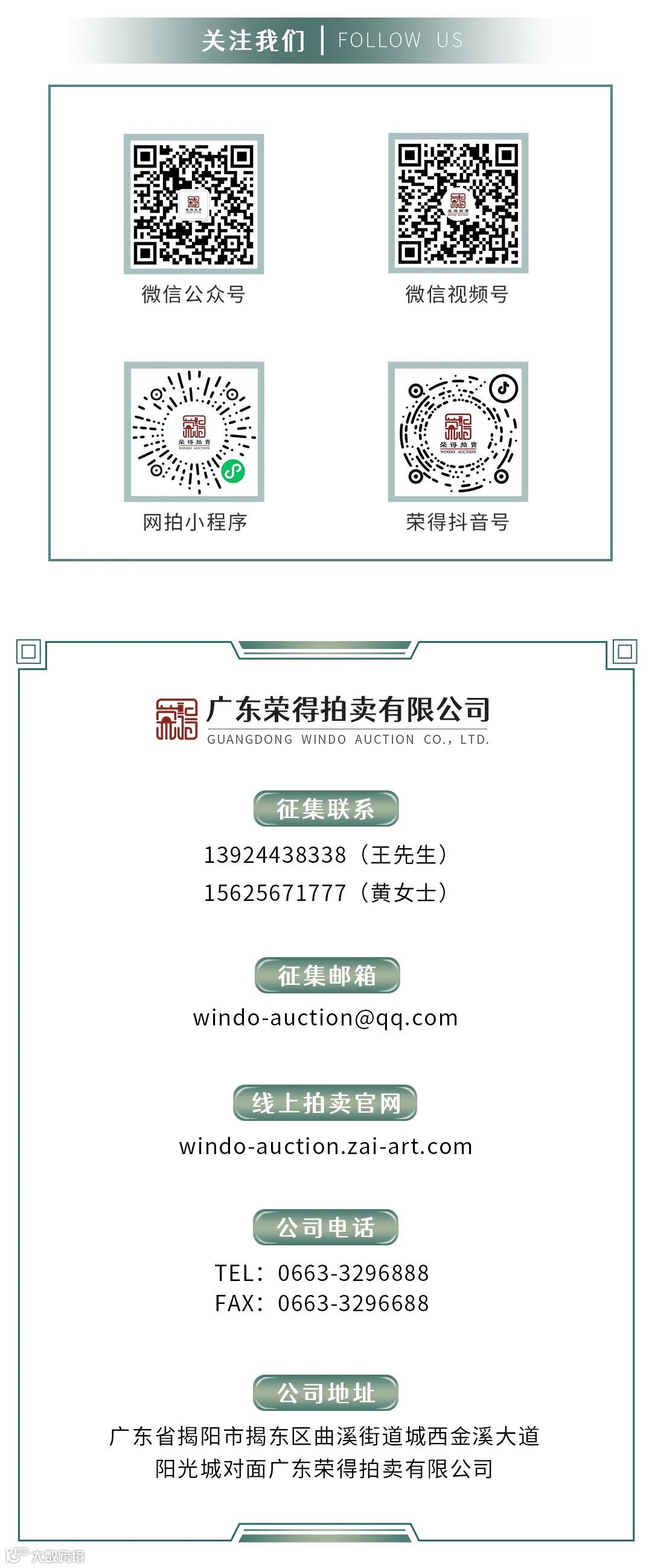 广东荣得国际拍卖有限公司官方运营号,为您提供艺术品投资与收藏的最新资讯和专业指引,及时发布本公司拍卖及展览信息。敬请垂询: 0663-3296888(总机) 邮箱:windo-auction@qq.com