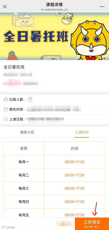 在课程详情页面,可以查看课程信息、上课时间、老师介绍等信息,确认后点击【立即报名】。