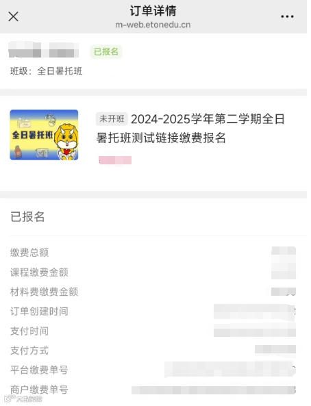 成功缴费后,家长可进入【托管学堂】,点击【我的订单】,点击订单标题进入,在订单页可查看订单详情,若出现刚刚缴费的课程,则代表成功报课。