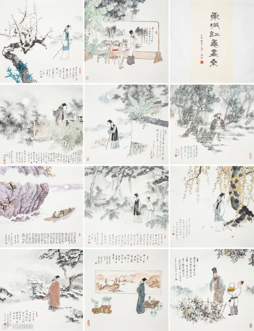 款识:东坡诗意画集。乙未秋暮于沈北,老弘。1.未成小隐聊中隐,可得长闲胜暂闲。我本无家更安往,故乡无此好湖山。癸巳写东坡诗意,老弘。2.荷尽已无擎雨盖,菊残犹有傲霜枝。一年好景君须记,正是橙黄橘绿时。苏轼《赠刘景文》诗意,乙未立秋于沈北,老弘。3.野水参差落涨痕,疏林欹倒出霜根。扁舟一楫归何处?家在江南黄叶村。苏轼《书李世南所画秋景》,老弘作于沈北塔南。4.元丰六年十月十二日夜,解衣欲睡,月色入户,欣然起行。念无与为乐者,遂至承天寺寻张怀民。怀民亦未寝,相与步于中庭。庭下如积水空明,水中藻、荇交横,盖竹柏影也。何夜无月?何处无竹柏?但少闲人如吾两人者耳。苏轼《记承天寺夜游》,癸巳立夏后二日于沈北,八六叟老弘。5.大江东去,浪淘尽,千古风流人物。故垒西边,人道是,三国周郎赤壁。乱石穿空,惊涛拍岸,卷起千堆雪。江山如画,一时多少豪杰。遥想公瑾当年,小乔初嫁了,雄姿英发。羽扇纶巾,谈笑间,樯橹灰飞烟灭。故国神游,多情应笑我,早生华发。人生如梦,一尊还酹江月。苏轼《念奴娇·赤壁怀古》,癸巳初夏于沈北舍利塔南,八六叟老弘。6.春来幽谷水潺潺,的皪梅花草棘间。一夜东风吹石裂,半随飞雪渡关山。东坡《梅花》诗,癸巳立夏于沈北,八六叟老弘。7.莫听穿林打叶声,何妨吟啸且徐行。竹杖芒鞋轻胜马,谁怕?一蓑烟雨任平生。苏轼《定风波》词意,乙未秋暮老弘。8.夜饮东坡醒复醉,归来仿佛三更。家童鼻息已雷鸣。敲门都不应,倚杖听江声。苏轼《临江仙》词意,癸巳立夏后三日于沈北,八六叟老弘。9.明月几时有?把酒问青天。不知天上宫阙,今夕是何年。我欲乘风归去,又恐琼楼玉宇,高处不胜寒。起舞弄清影,何似在人间。转朱阁,低绮户,照无眠。不应有恨,何事长向别时圆?人有悲欢离合,月有阴晴圆缺,此事古难全。但愿人长久,千里共婵娟。苏轼《水调歌头》,丙辰中秋,欢饮达旦,大醉,作此篇,兼怀子由。癸巳夏月于沈北塔南,八六叟老弘。10.人生到处知何似,应似飞鸿踏雪泥;泥上偶然留指爪,鸿飞那复计东西。苏轼《和子由渑池怀旧》诗意,乙未老弘。11.罗浮山下四时春,卢橘杨梅次第新。日啖荔枝三百颗,不辞长作岭南人。东坡居士。乙未沈北老弘。
