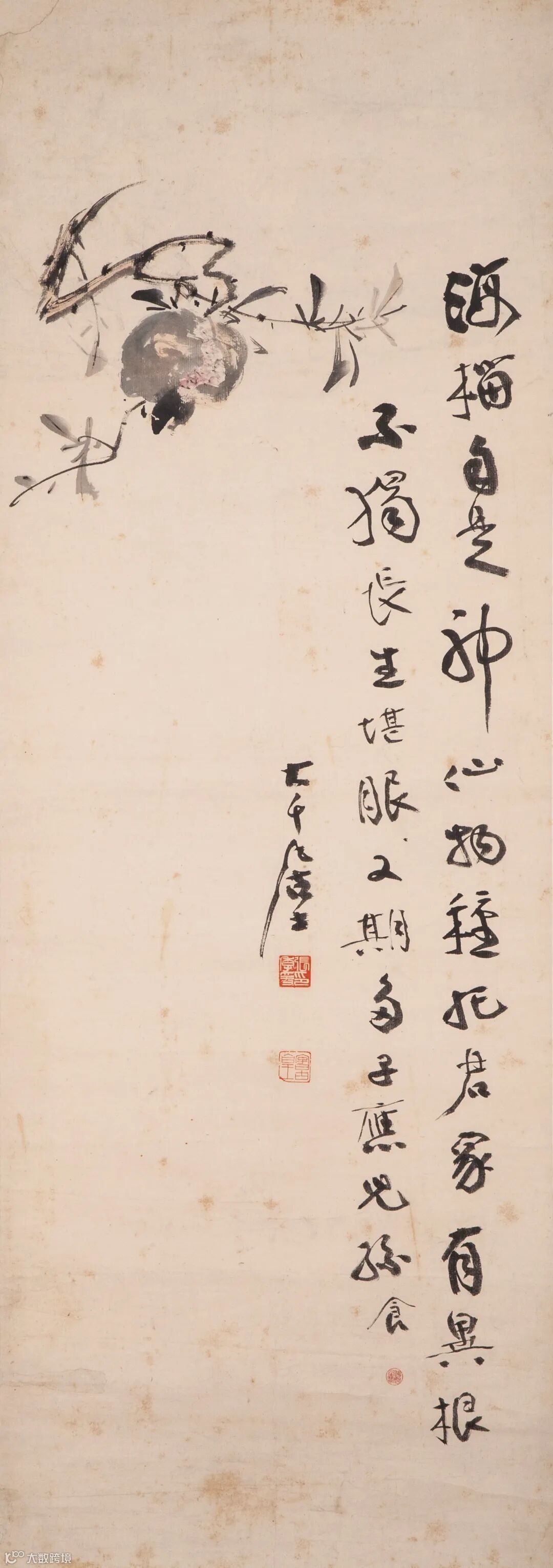 款识:海榴自是神仙物,种托君家有异根。不独长生堪服食,又期多子应儿孙。大千居士。