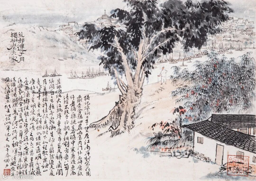款识:□画名山汗漫驱,游笔文沈与唐仇。老来不觉聪明减,聊尔赠君一笑休。壬子夏五月唐云寄大铁老友画。