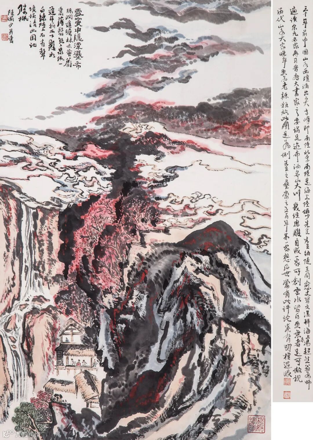 边跋:三十年前中国山水画坛涌出二大高峰,即南陆北李,南陆是海上陆俨少先生,先生幼随王同愈丈习文,后拜海上冯超然翁为师,遍读宋元名家,再习晋唐大书家之要诣,足迹布洒名山大川,几经磨难自成一家,所创云水留白更无来者,足可傲视历代山水大家,晚年更为老辣狂放,此图是为例,先生之艺当之五百年第一家,想后世当有此评论,戊戌九月明权过眼。