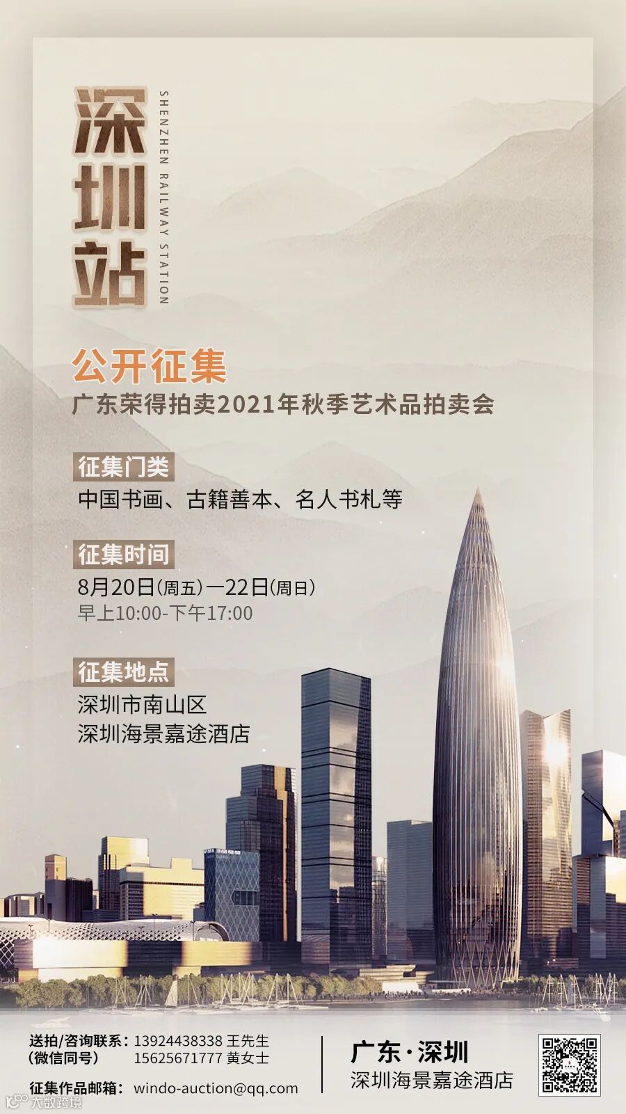 8月20日至22日,广东荣得拍卖再次踏上征集之旅,2021年秋季艺术品拍卖会公开征集——深圳站正式开启。