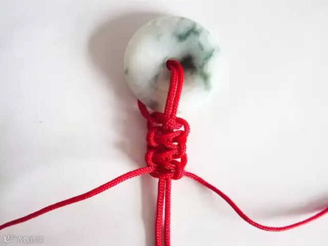 12.到这一个步骤翡翠平安扣打结系法就全部完成了。可根据自己绳子的长短结束编织,余下的绳头长的话可剪去部分,留下一点用打火机烧一下,黏在绳上,防止平安扣脱绳。