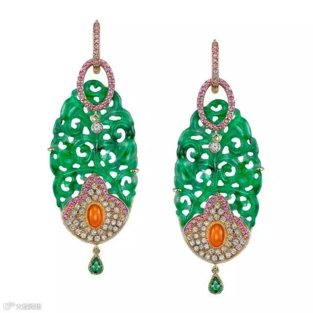 西方人把对色彩的组合的优势,也发挥到了翡翠首饰的设计之中。你瞧!只用了一些钻石和彩宝点缀,这些翡翠就焕发出机具现代感的魅力。