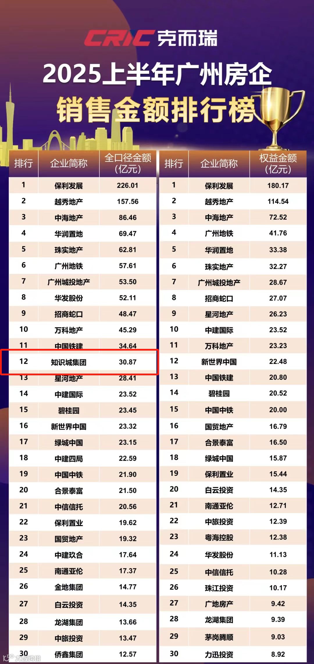 2025年已过半,知识城城发超前超额达成半年度业绩目标;知识城集团荣登2025上半年广州房企销售金额榜TOP12(克而瑞),国匠实力,全城共鉴!