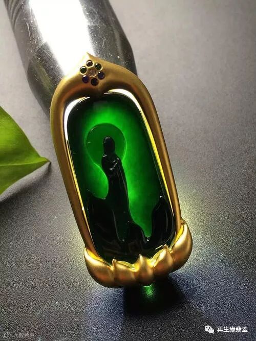 其实,最初墨翠是称为“广片种”翡翠,由于其颜色比较深,在缅甸主要是用来加工成一些方形、长方形的薄片状戒面,称为“广片”,主要用来作为戒指、吊坠和项链的镶嵌,“广片”翡翠一般都磨得比较薄,通过镶嵌金银的衬底,会将绿色从内部反射出来,黑中映绿,耐人寻味。在90年代,“广片”的价值也不算高,每片售价也仅有百十元。但在进入本世纪以后,国内雕刻师们发现墨翠质地比较细腻,可以用来像和田玉一样进行精细的雕刻加工,使得墨翠再也不是用来加工成“广片”戒面了,而是用来雕刻成精美的挂件,也将其称之为“墨翠”,价值也随之一路飙升,年年翻番,一跃成为高档次的翡翠品种之一。
