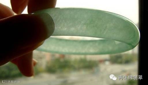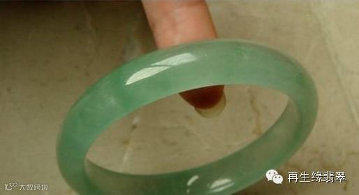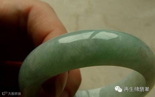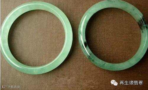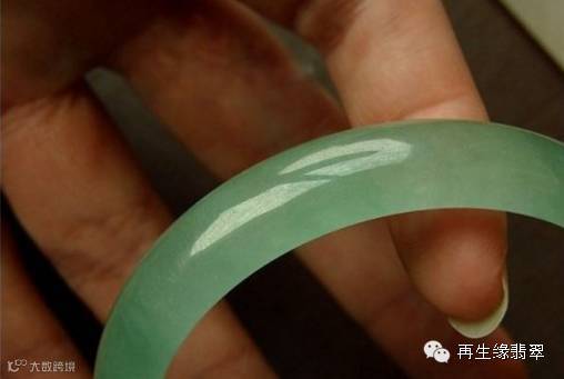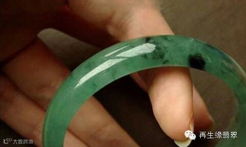 由于注胶,B货在紫外荧光灯下呈粉蓝色或黄绿色荧光(有较强的荧光),轻轻敲击B货翡翠手镯,其声音沉闷,而A货翡翠手镯的声音清脆悦耳。