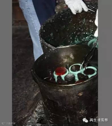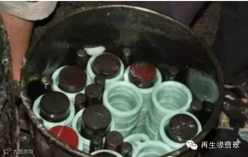 ⑩注胶并染色的未抛光翡翠,注胶过程需要几天时间
