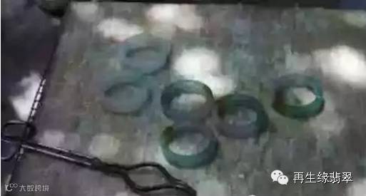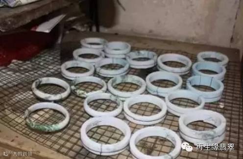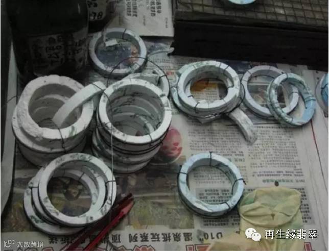 ②切割后的手镯原料雏形毛坯,因为裂多所以先要绑起来(这些料一般都是没水、没底、没色!)