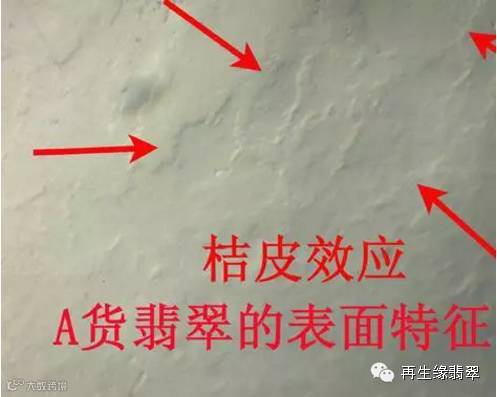 此外,用放大镜可观察到翡翠B货表面有桔皮般凹坑麻点,(有人称之为“桔皮效应”,但事实上并不是,翡翠的“桔皮效应”只是A货翡翠特有的特征)。