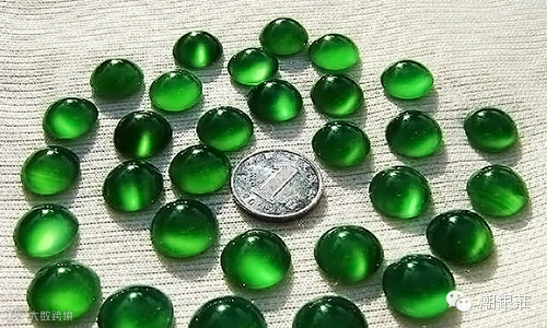 绿玉髓,清爽的翠绿色中带着点点黄色,常常让人们想起“在金子中诞生的宝石”,色泽和外表特别像翡翠,受到众人的青睐。