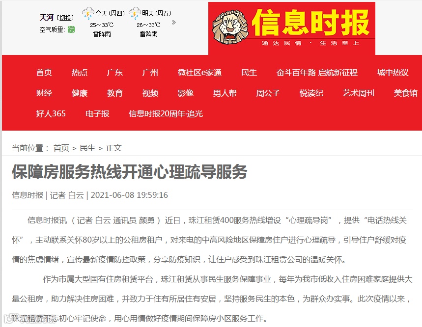 疫情防控有“力度”,民生保障有“温度”。面对疫情,珠江租赁一手抓疫情防控、一手抓民生保障,以“实干+实效”,全面织牢疫情防控期间社区民生服务保障网,近期获得广州日报、羊城晚报、今日头条、信息时报、广州新闻电台等媒体报道。