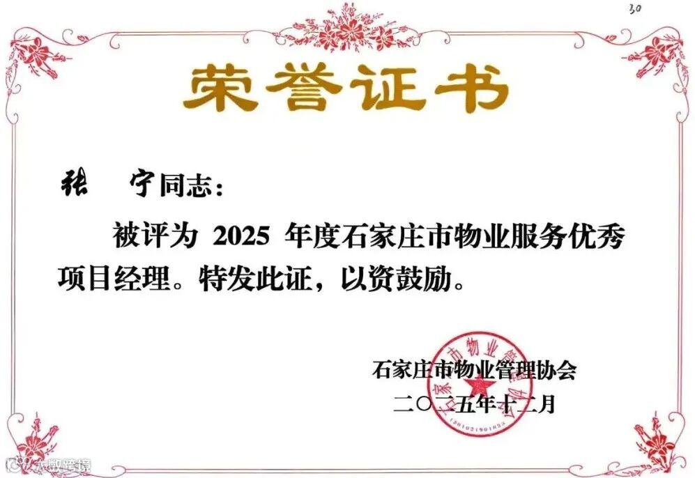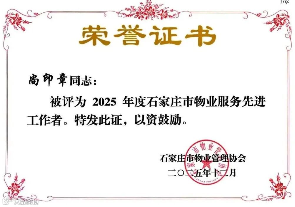港誉物业凭借稳健的经营业绩、显著的数智建设、创新社区增值服务能力铸就企业竞争力,荣膺2025年度石家庄市物业管理“省会知名品牌”,港誉物业业务管理部工程经理尚印章获评“2025年度石家庄市物业服务先进工作者”,槐安广场服务中心经理张宁获评“2025年度石家庄市物业服务优秀项目经理”。