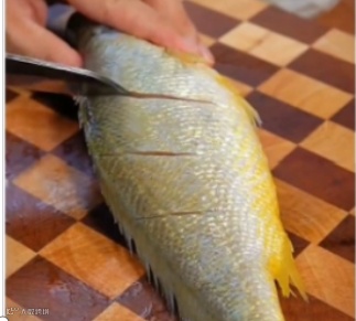 1、新鲜大黄鱼一条,刮除鱼鳞,充分洗净鱼腮和脊骨血后,在鱼背两面都改花刀,宽度在一指左右,蒸制更入味。