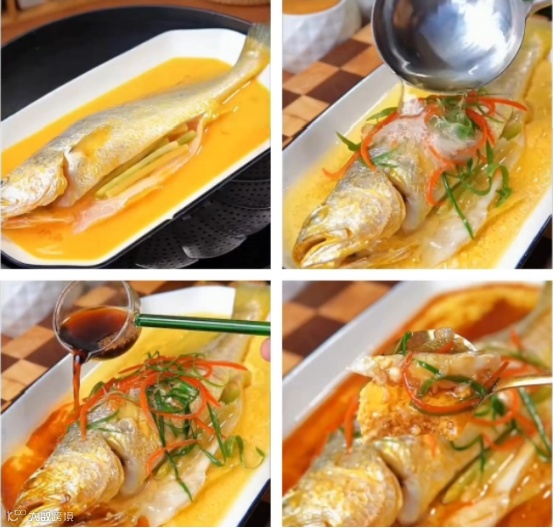 5、十分钟以后,取出蒸好的大黄鱼,把准备好的红椒丝、葱丝,均匀撒到鱼身上,再浇上一勺热油,激发出食材的香味。最后再均匀倒入一圈蒸鱼豉油,便可端上桌食用了。