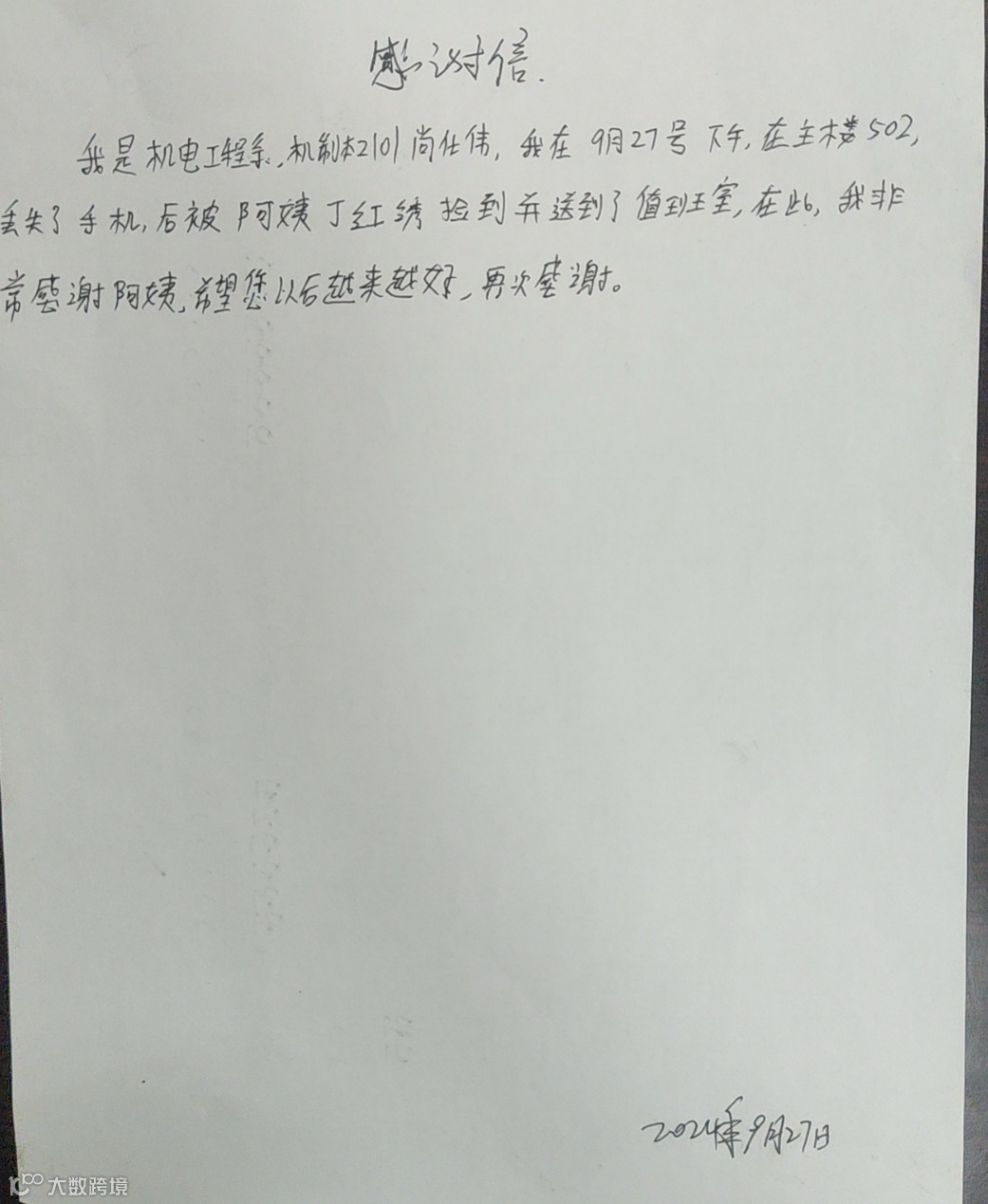 失主尚同学来到港誉物业值班室拿到失而复得的手机,激动之情溢于言表,为了表达谢意送了一封感谢信,在学校后勤管理处和港誉物业共同管理下,像丁红锈这样拾金不昧的保洁人员还有很多,他们多次捡到电脑、手机、身份证、银行卡、钱包等物品,但面对这些“意外之财”,他们都毫不犹豫地归还失主。