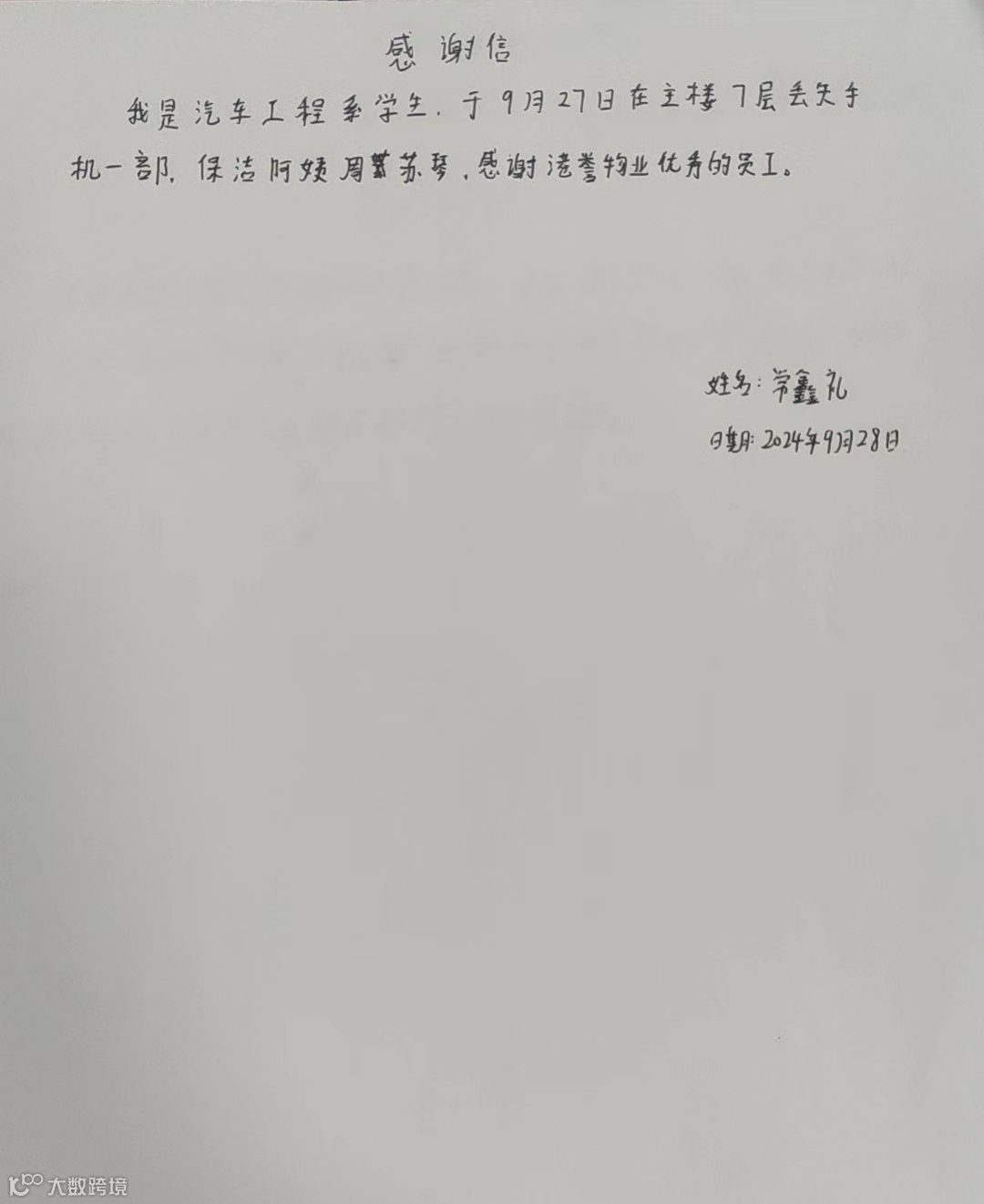 “当时我心情忐忑拨打自己的电话,刚响了一声就接通了,说明情况后,港誉物业值班师傅还安慰我不要着急,并跟我约定好拿回手机的地点,真是太感谢了!”在9月27日晚,港誉物业河北科技工程职业技术大学服务中心保洁丁红锈在日常打扫教学楼时,发现地面有一部手机,心想失主一定很着急,于是在原地等待了片刻,见未有人认领,便立刻上报服务中心并将手机放置值班室妥善保管,只等失主来寻时第一时间归还。