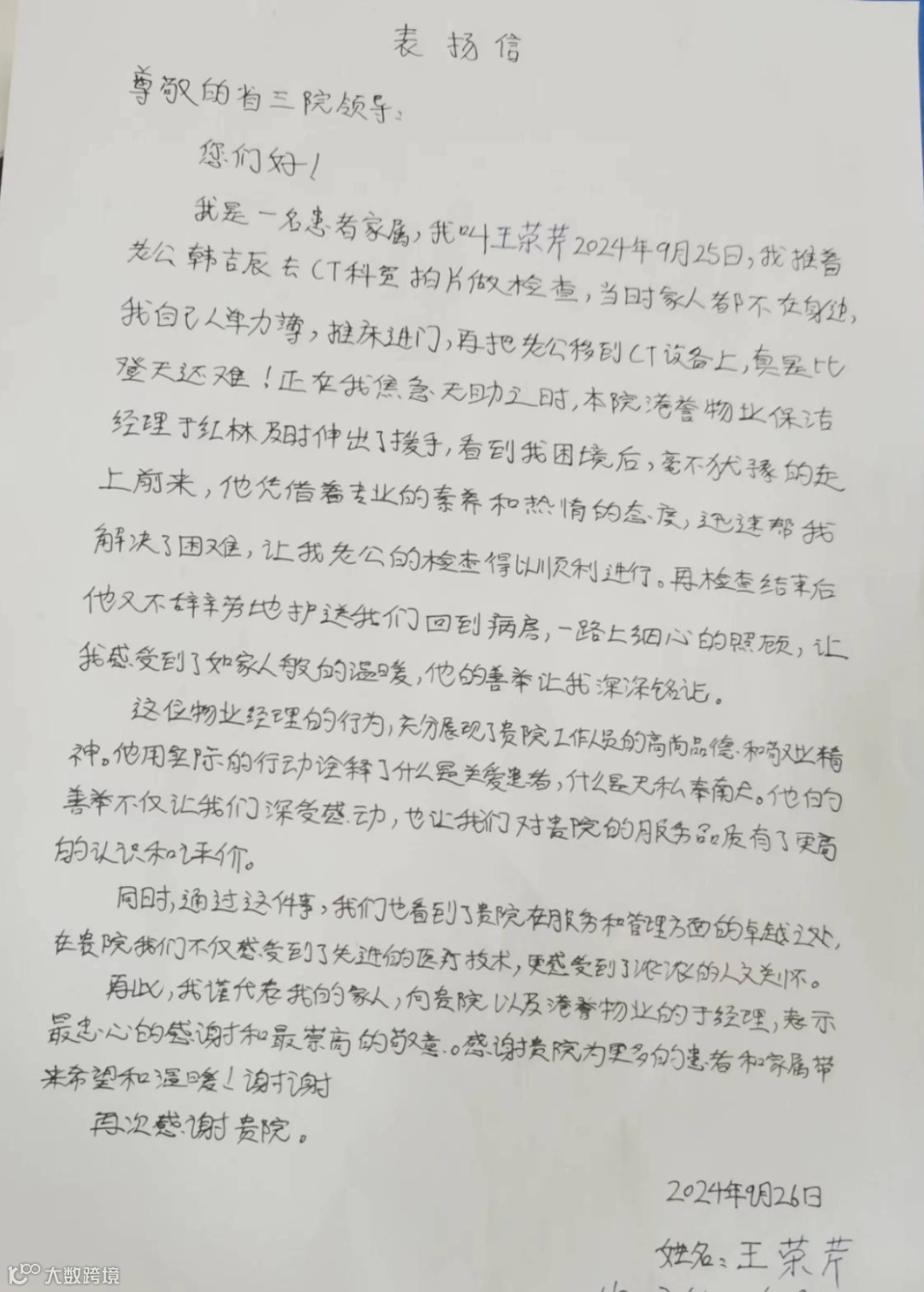 “就这一次看病,我是真正感受到了港誉物业工作人员的热情服务,虽不是人家的工作范围,但他真的很暖心,及时伸出援手全程用心帮忙,没让我们跑一点冤枉路,住院期间医护人员的照顾也非常周到、细心。”顺利做完检查后,王女士怀着感谢的心情,亲笔写了对港誉物业与省三院的感谢信。