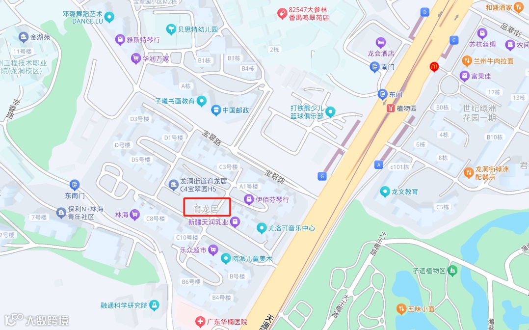 育龙居小区位于天源路主干路上,在天河区华南植物园对面,内有居民楼28栋近1400户业主,6号线植物园地铁站步行3分钟即达,周边都是住宅小区,生活交通方便,附近有龙洞步行街,商业氛围浓厚。