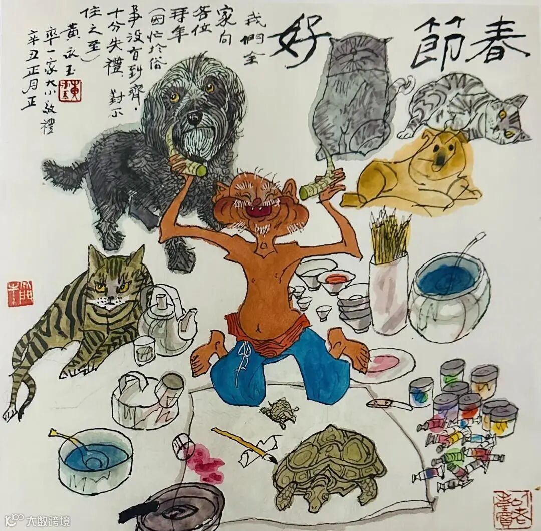 他的画不按常理出牌:荷花可以浓墨重彩,老鼠可以遛猫,兔子可以是蓝色的,猫头鹰可以睁一只眼闭一只眼,还会在画上写俏皮的话,让人看了忍不住笑。