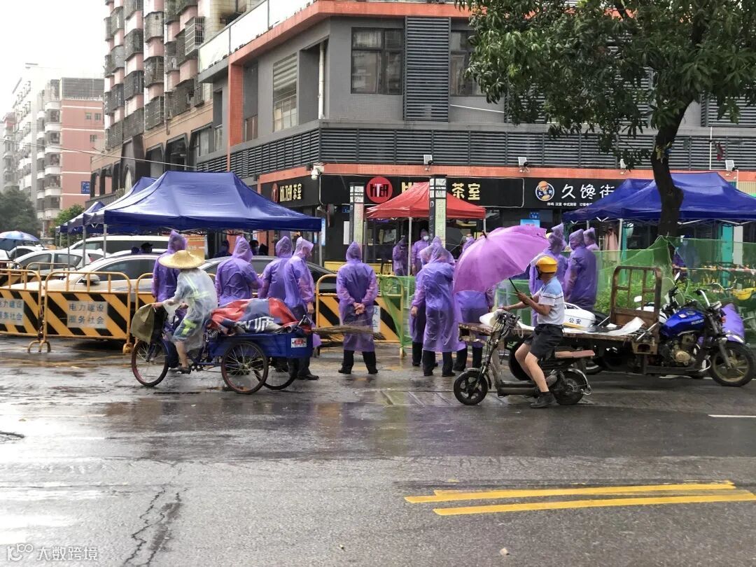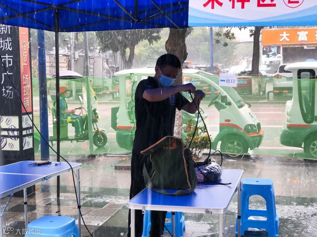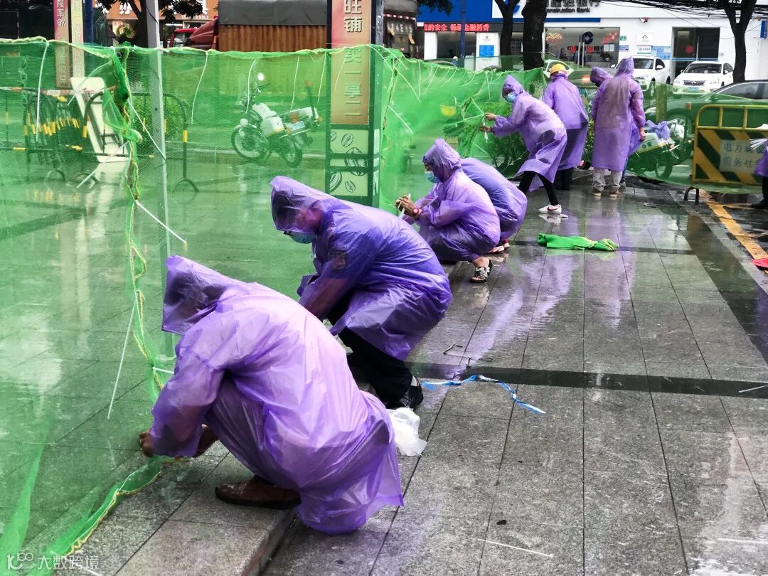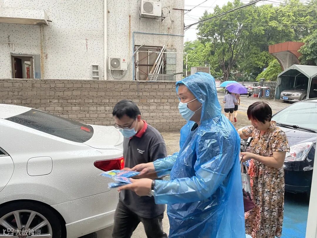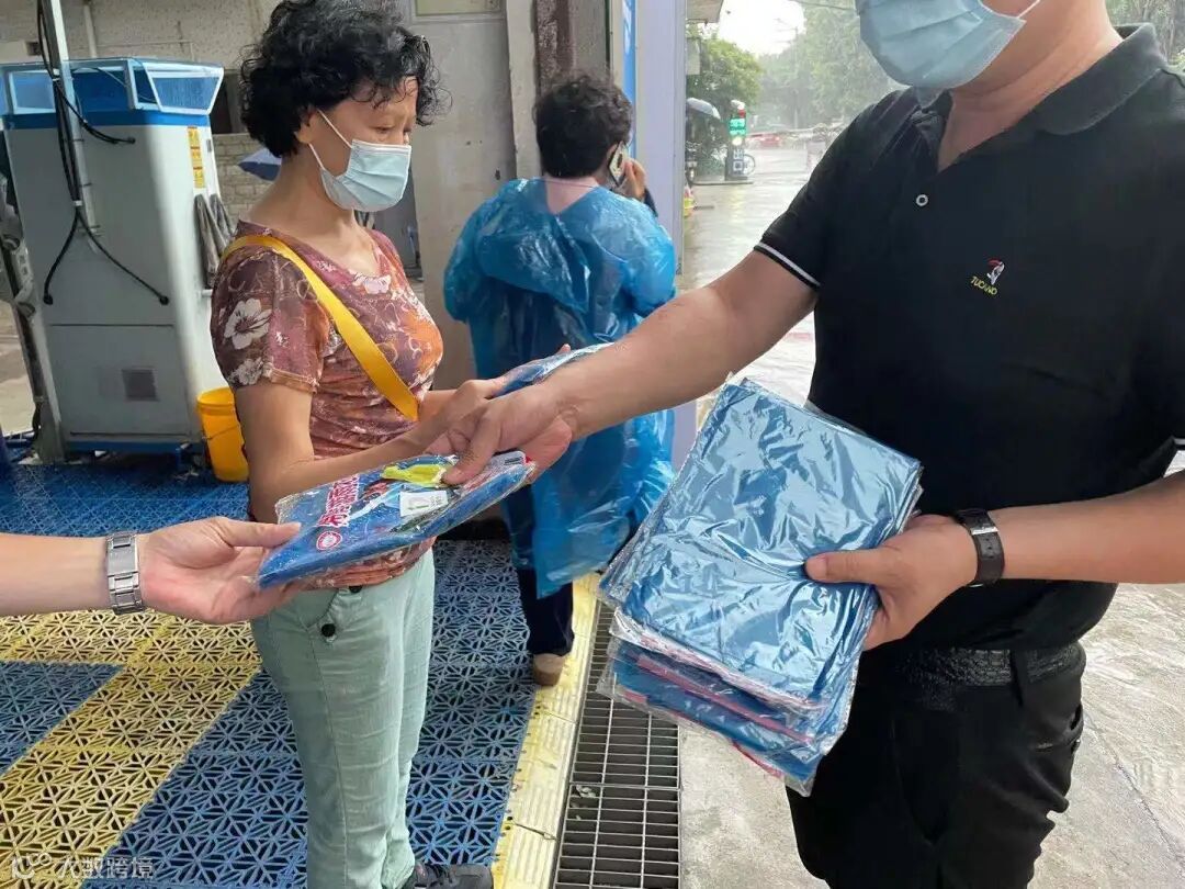 下雨期间,新城市集团员工替没带雨具的受检群众穿上雨衣,同时现场也布置有志愿者服务点,为受检群众提供指引,协助开展核酸检测工作。