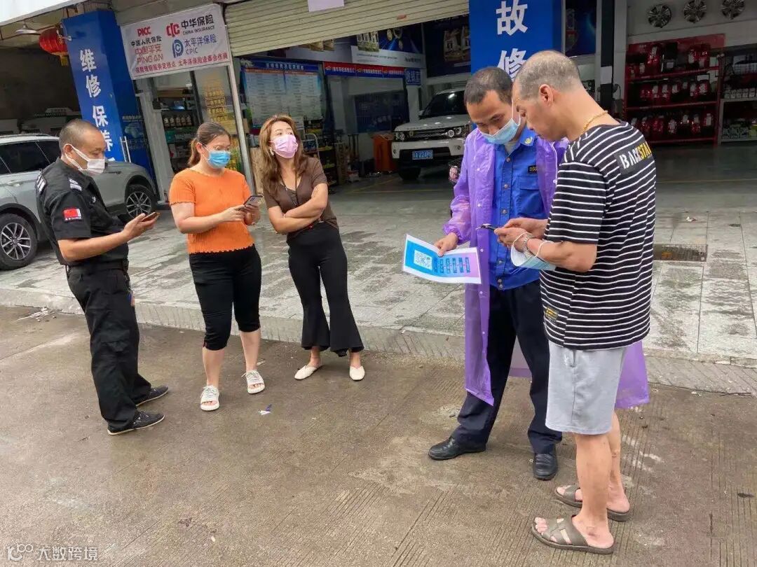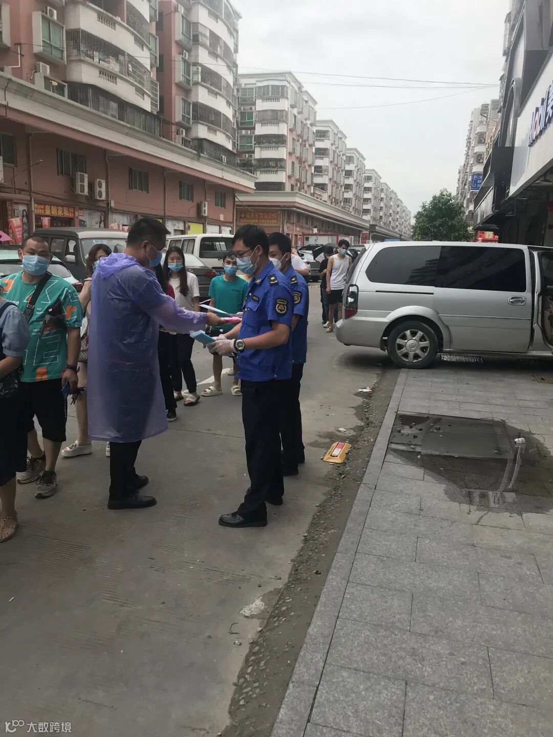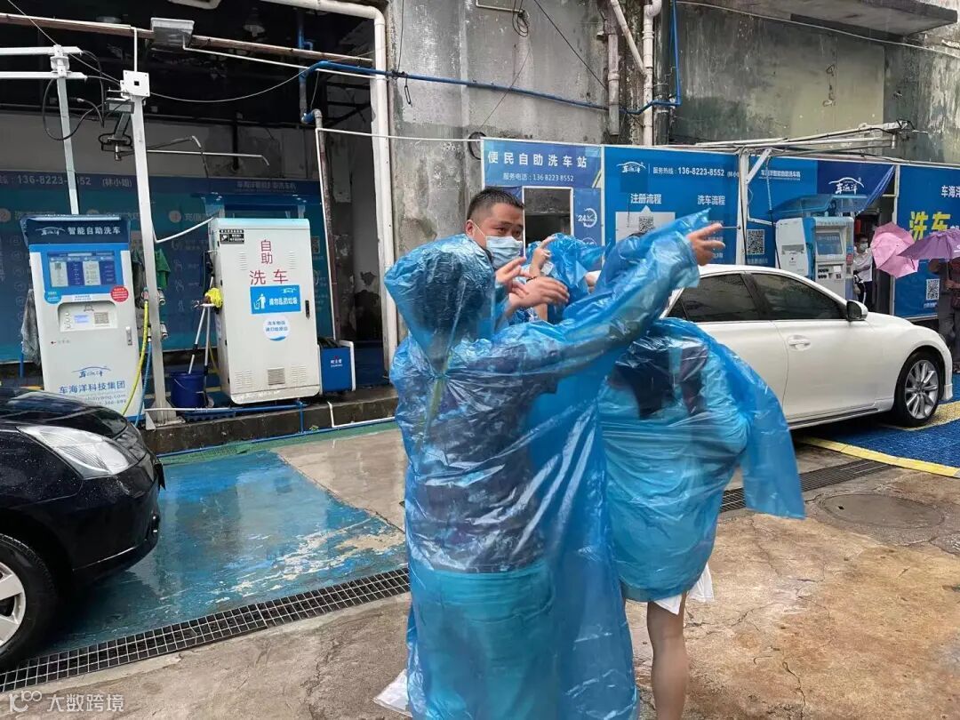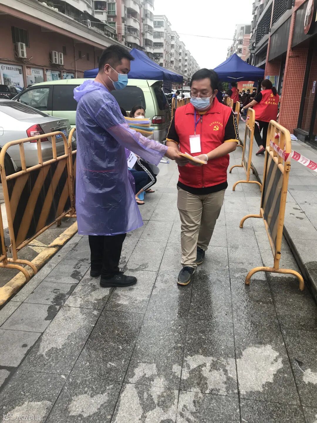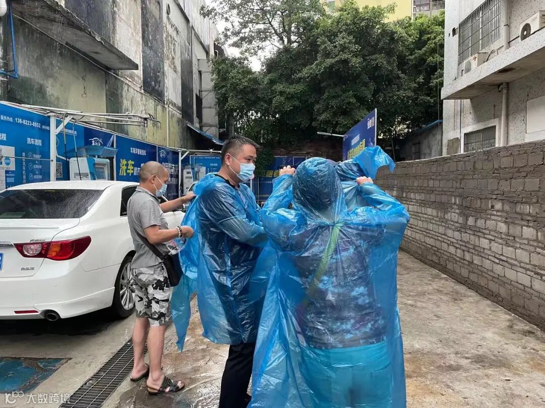 下雨期间,新城市集团员工替没带雨具的受检群众穿上雨衣,同时现场也布置有志愿者服务点,为受检群众提供指引,协助开展核酸检测工作。