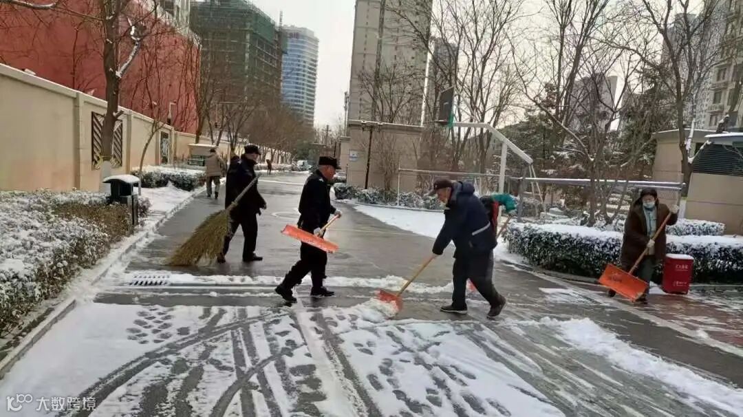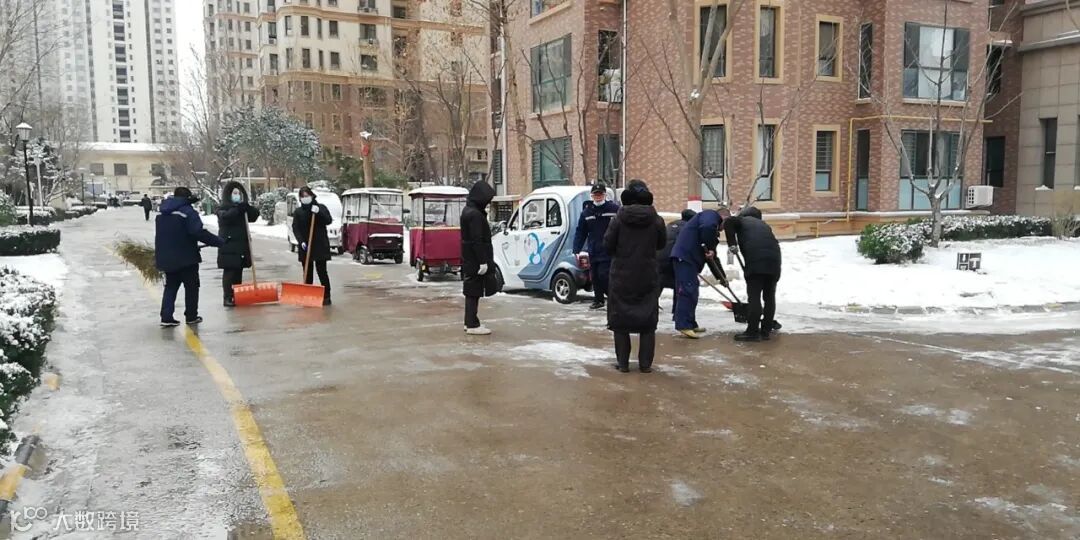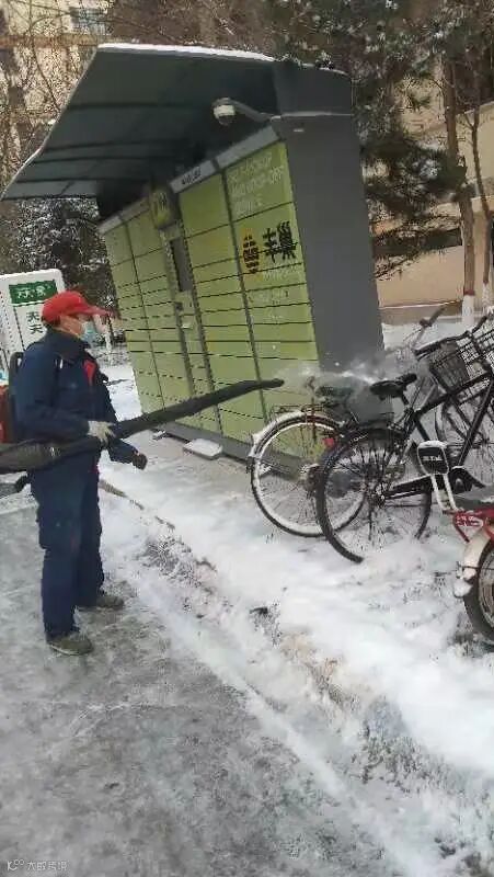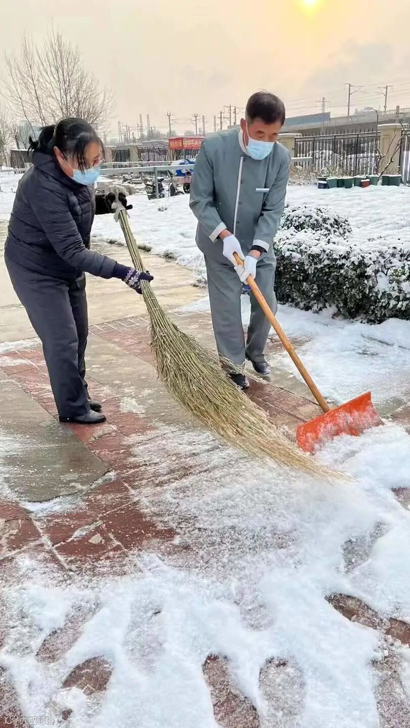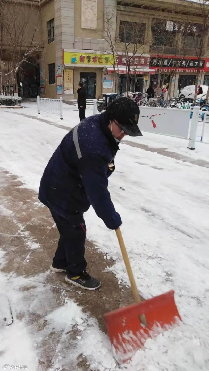 大家不畏严寒,积极主动,相互配合,挥舞着铁锹、拿着扫帚、背着吹雪机铲雪除冰,呈现出一幅热火朝天的景色。