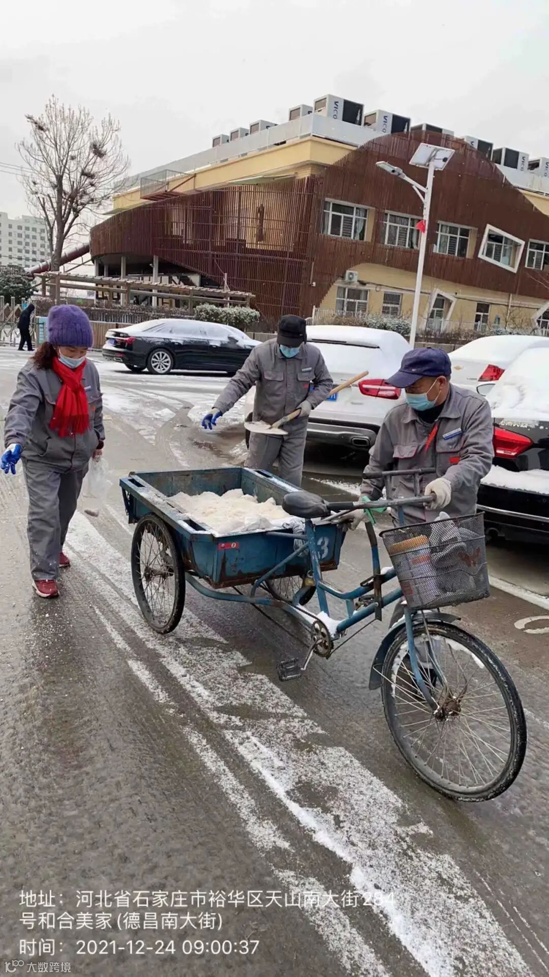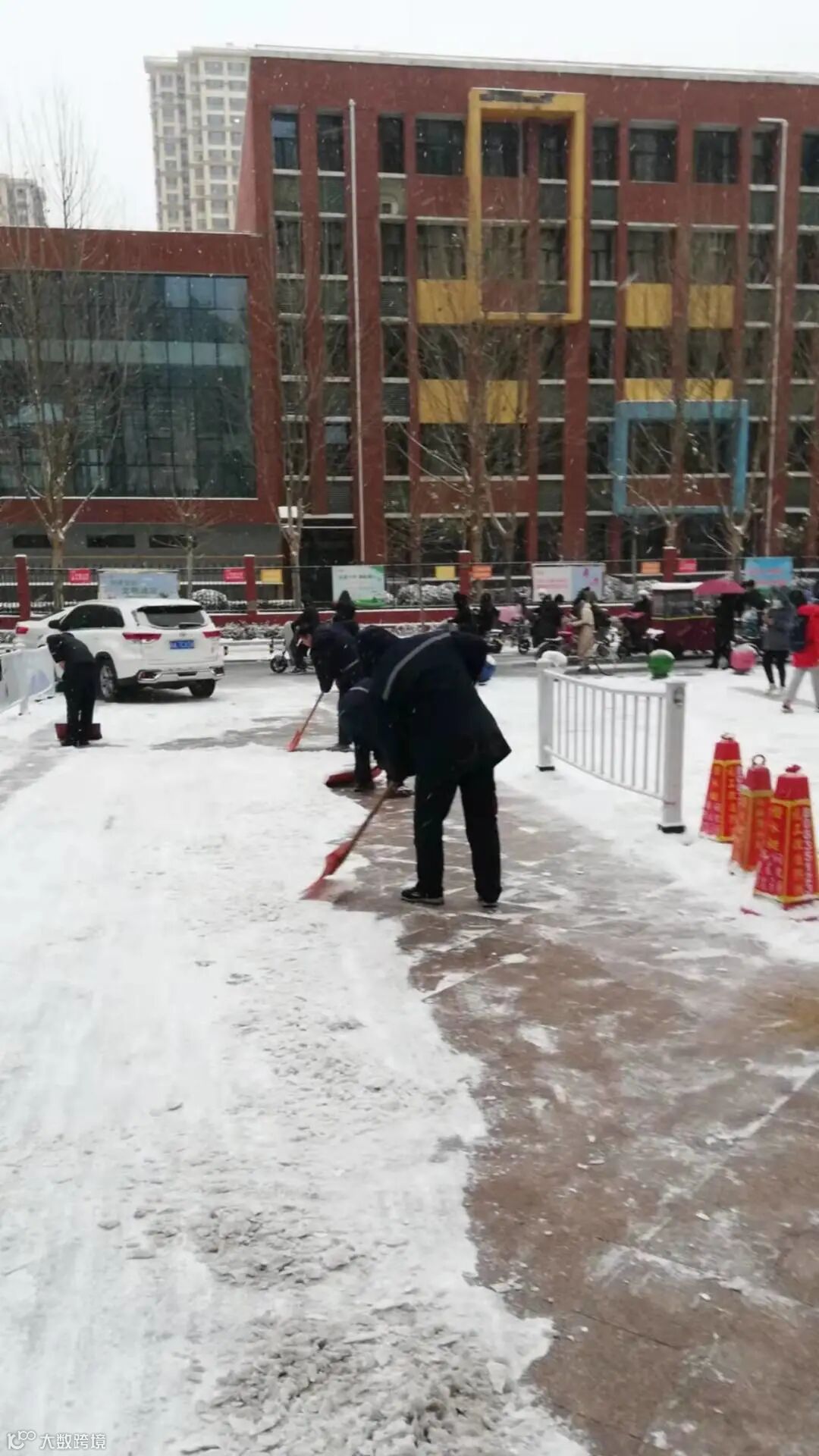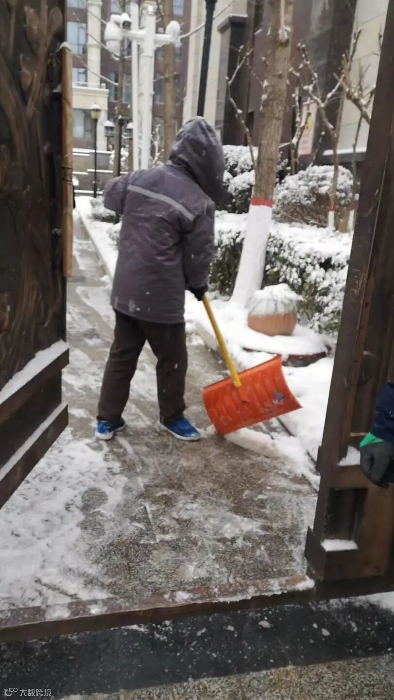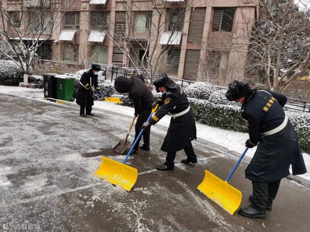 大家不畏严寒,积极主动,相互配合,挥舞着铁锹、拿着扫帚、背着吹雪机铲雪除冰,呈现出一幅热火朝天的景色。