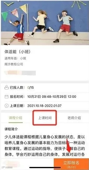 在课程详情页面,可以查看课程信息、上课时间、老师介绍等信息,确认后点击【立即报名】。