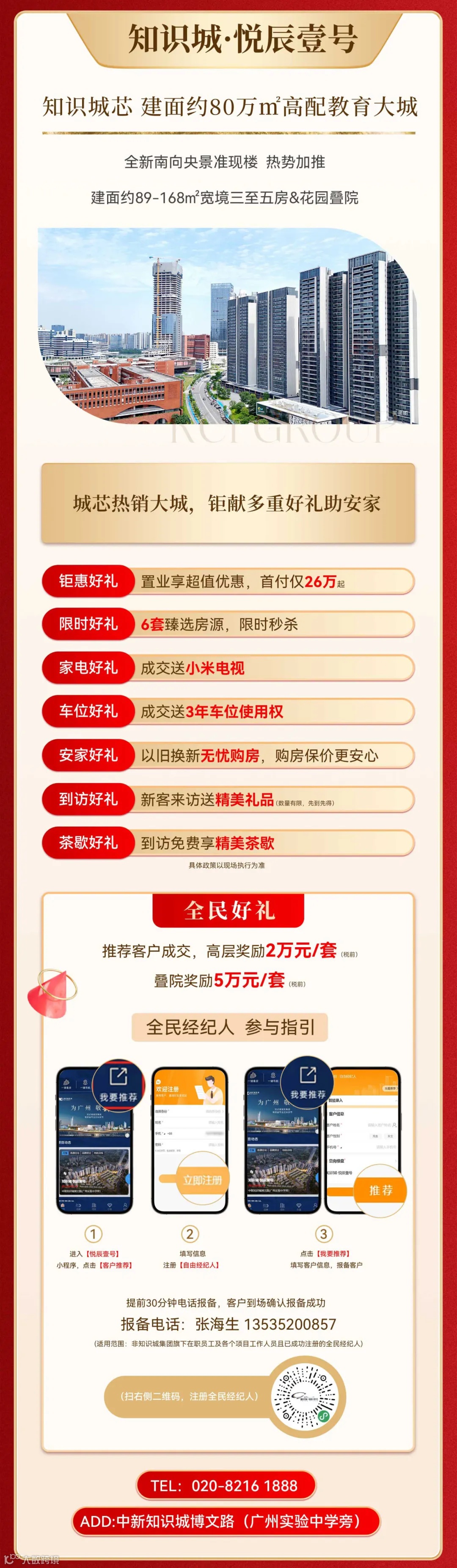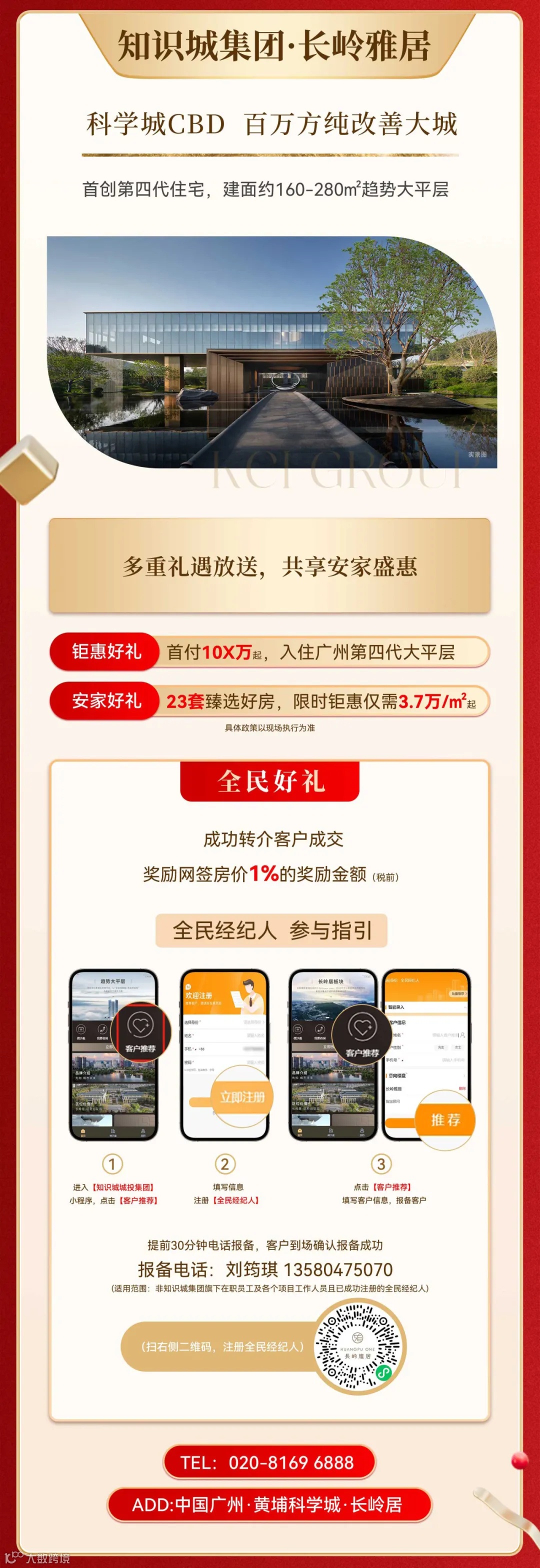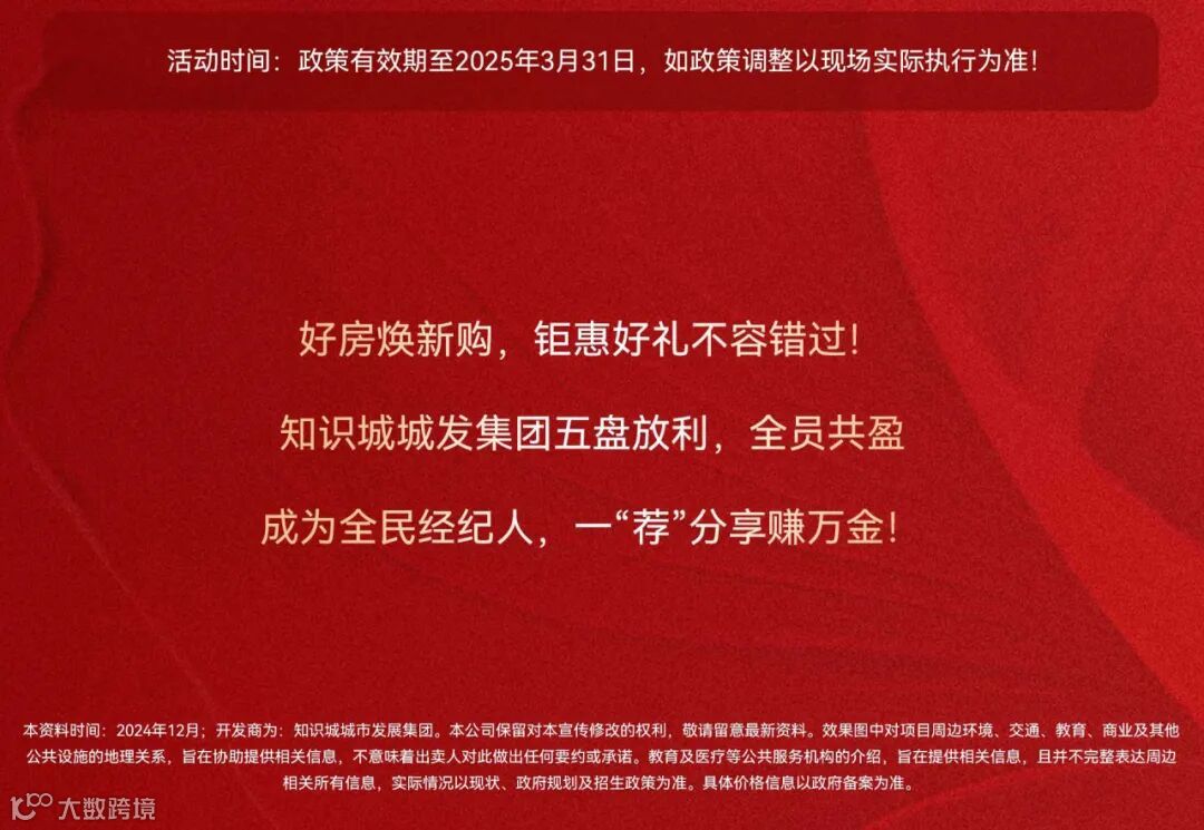 本资料时间:2024年12月;开发商为:知识城城市发展集团。本公司保留对本宣传修改的权利,敬请留意最新资料。效果图中对项目周边环境、交通、教育、商业及其他公共设施的地理关系,旨在协助提供相关信息,不意味着出卖人对此做出任何要约或承诺。教育及医疗等公共服务机构的介绍,旨在提供相关信息,且并不完整表达周边相关所有信息,实际情况以现状、政府规划及招生政策为准。具体价格信息以政府备案为准。